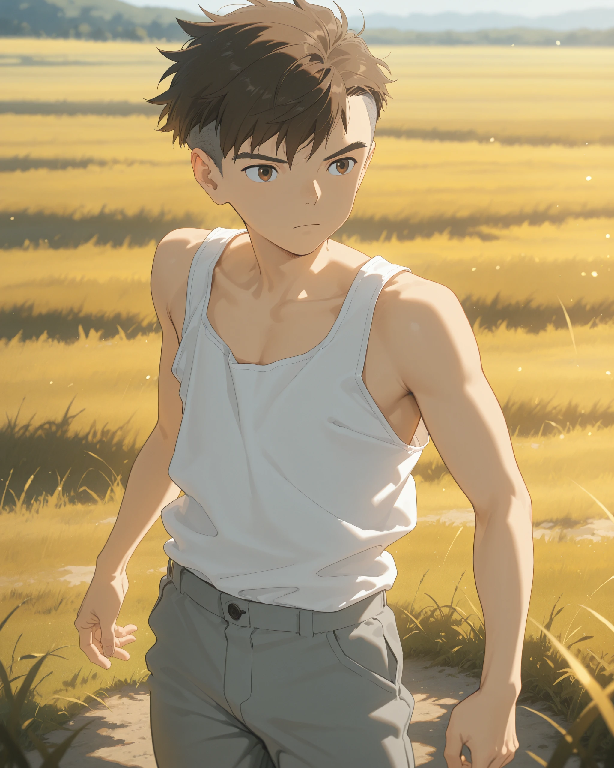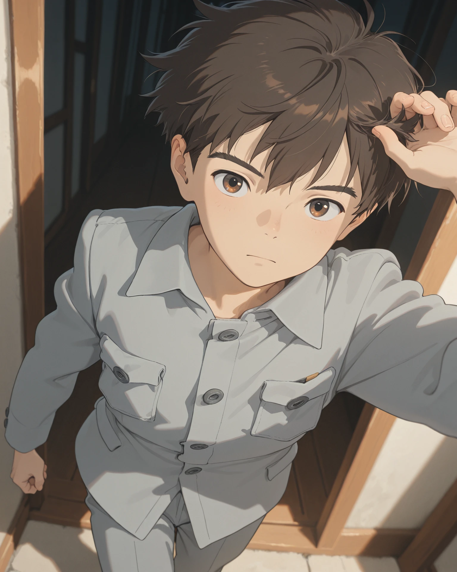 Mahito Maki, the protagonist of The Boy and the Heron, is depicted as an 11-year-old. His appearance reflects his quiet and introspective nature, often shown with a serious and contemplative expression. He has a youthful appearance, consistent with his age, and his physical presence in the film complements his character's emotional depth and journey. His attire and overall look are indicative of a typical young boy of his era, further grounding him in the film's historical setting. (source)