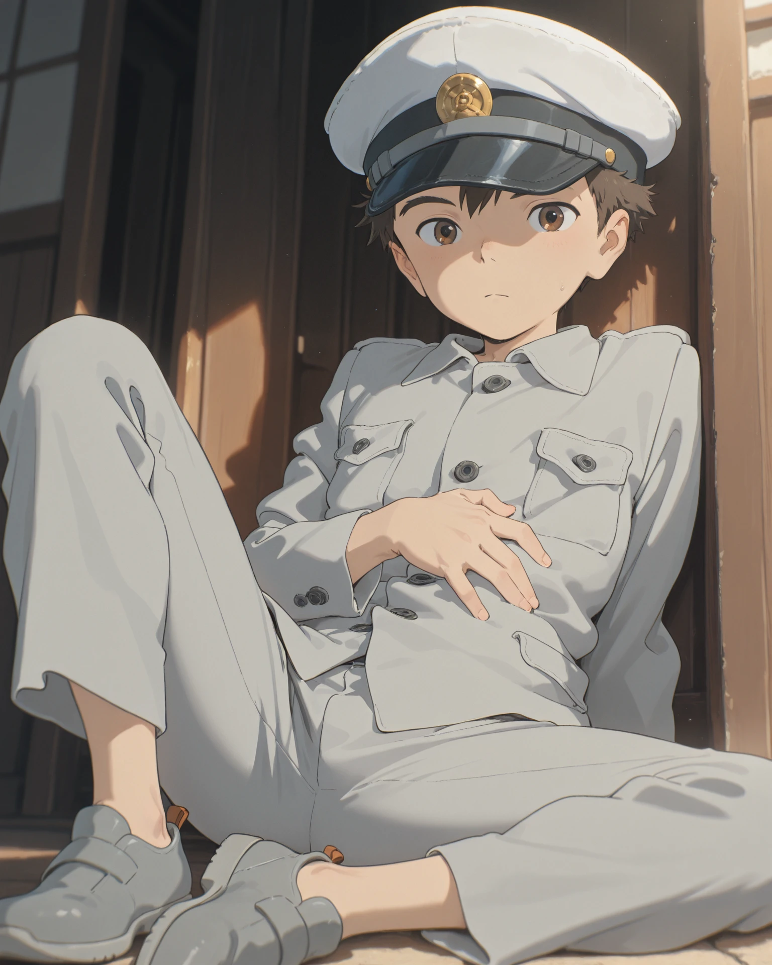 Default outfit: white peaked cap, grey collared shirt, breast pocket, grey pants, grey footwear, shoes
