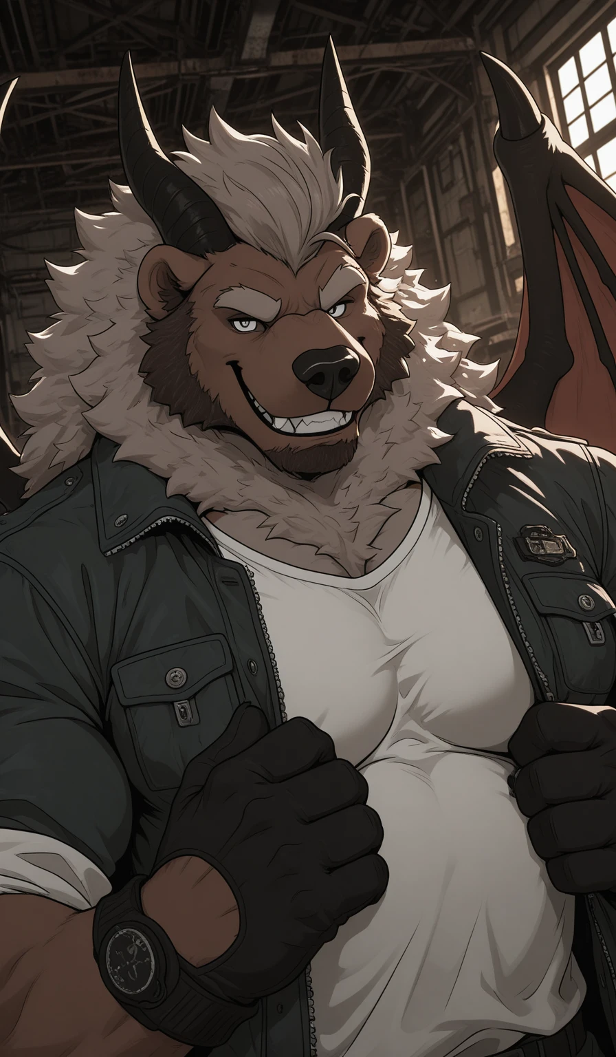 1boy,Xan,anthro bear,furry male,bara,muscular male,large pectorals,horns,wings, thick thighs,animal ears,tail