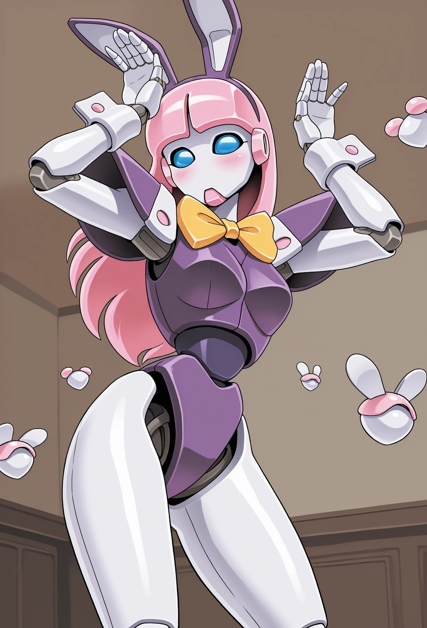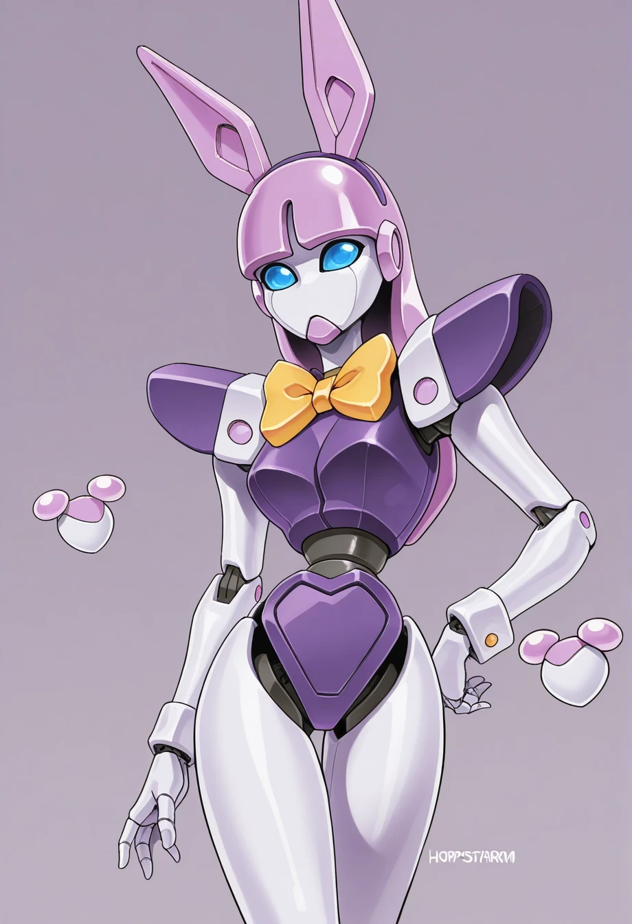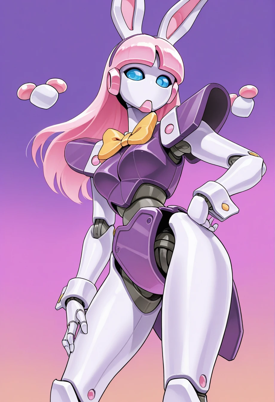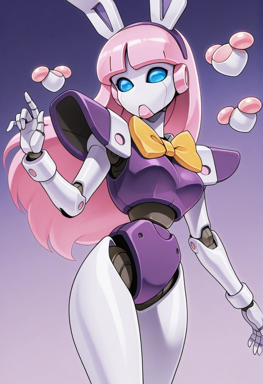 hopstarm, robot, humanoid robot, no humans, blue eyes, yellow bow, drone, purple long ears, pink hair