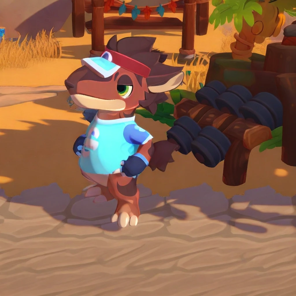 bosko, male, Andrewsarchus, brown skin, furry, green eyes, 4 fingers, 3 toes, blue t-shirt, sports cap, sports gloves