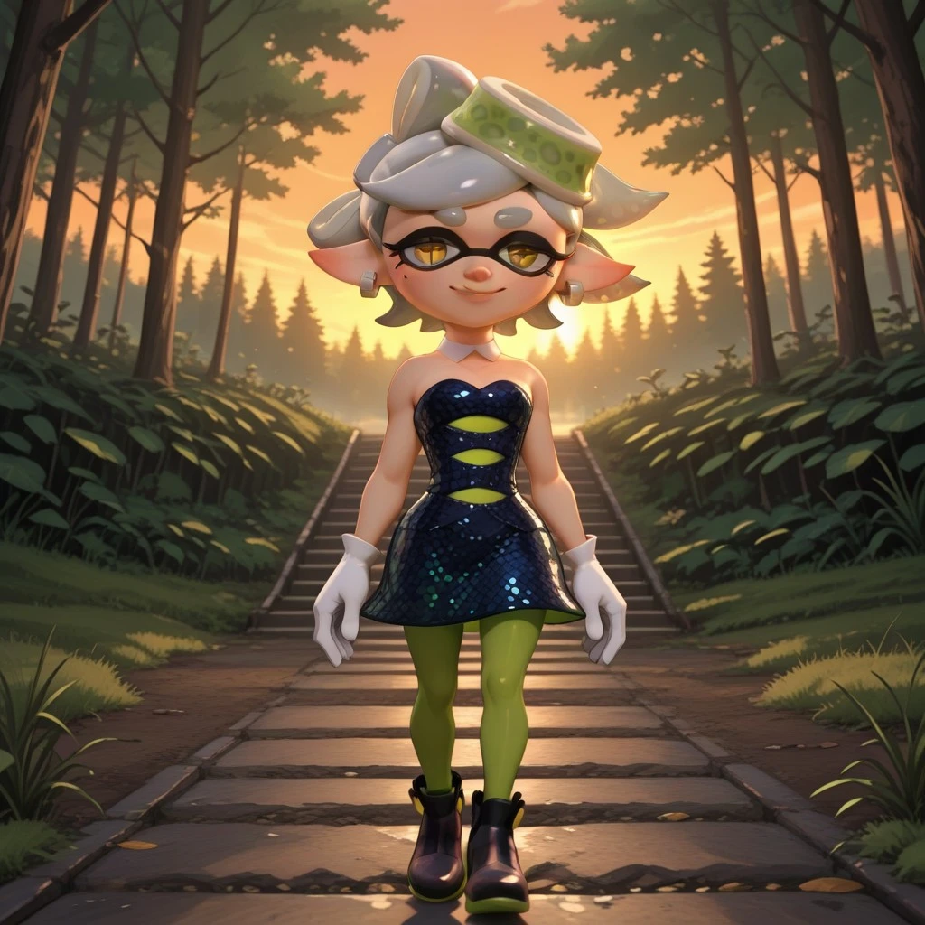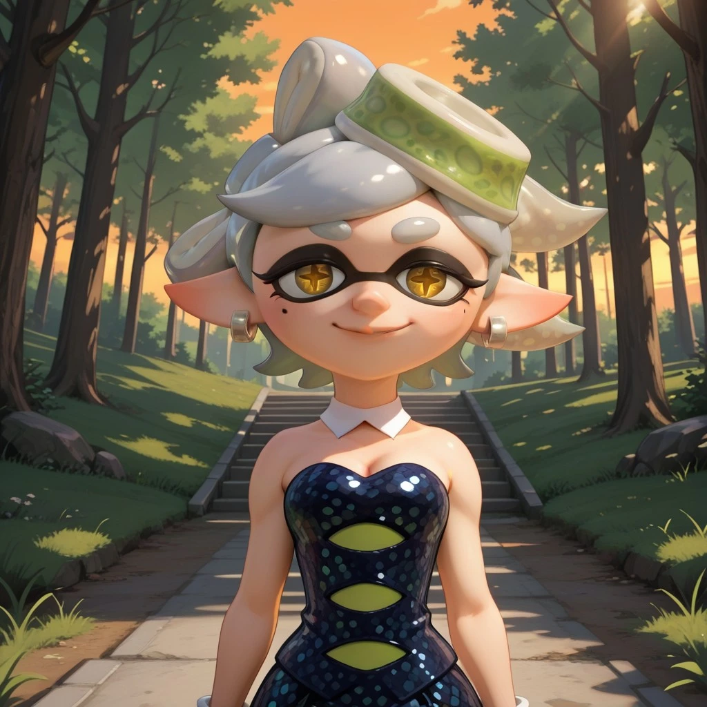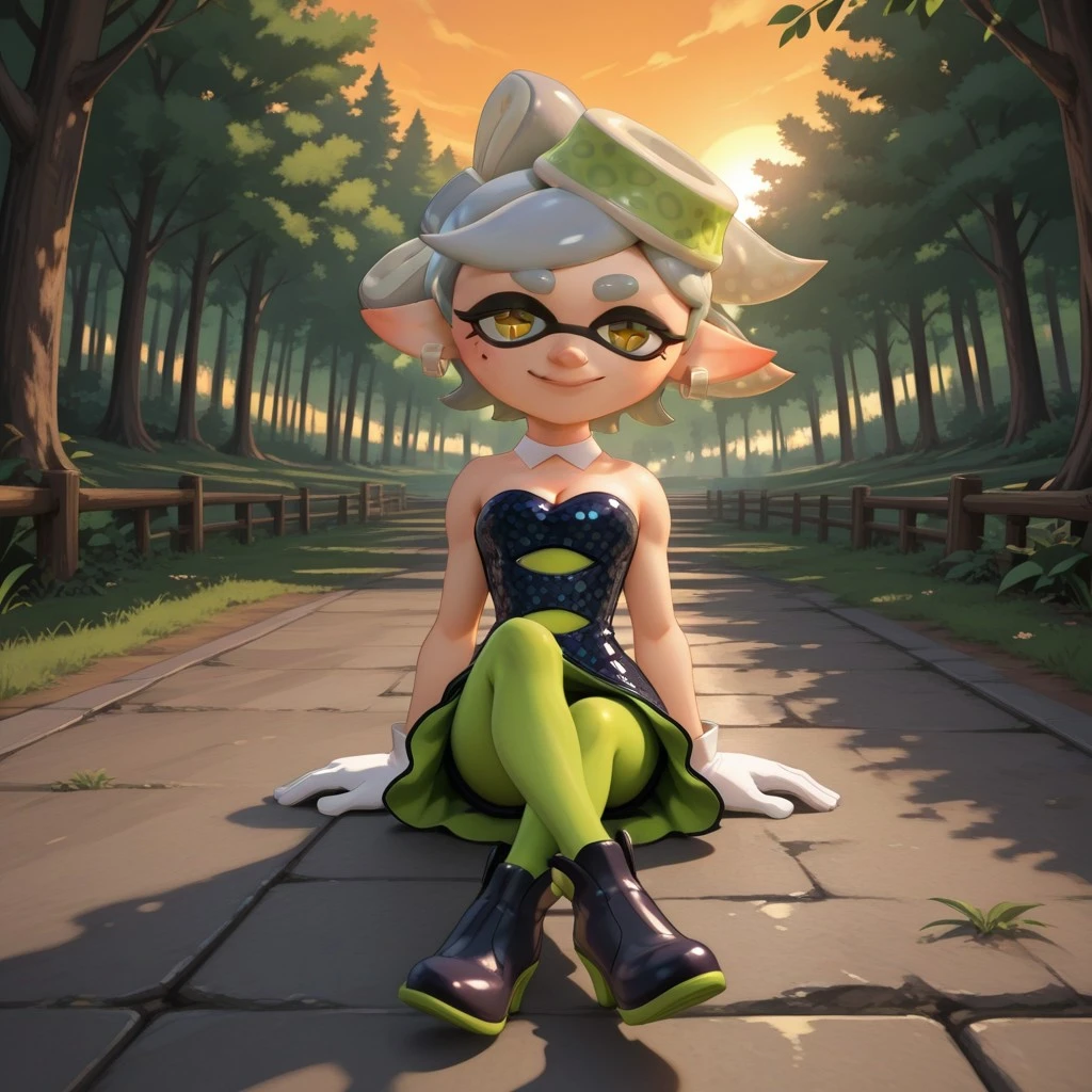 MarieSP, 1girl, fangs, grey hair, mole, mole under eye, pointy ears, short hair, yellow eyes, +_+, domino mask, mask, tentacle hair, choker, cleavage, dress, earrings, green tights, jewelry, tights, short hair, strapless, strapless dress, black shoes