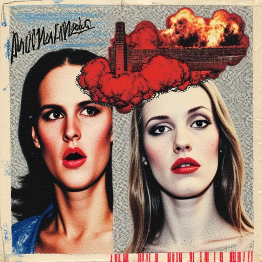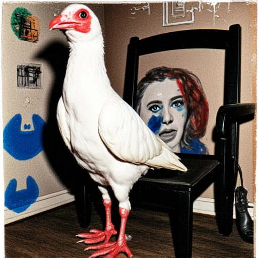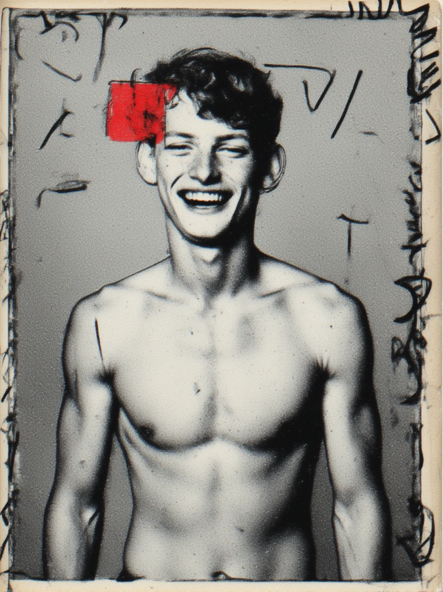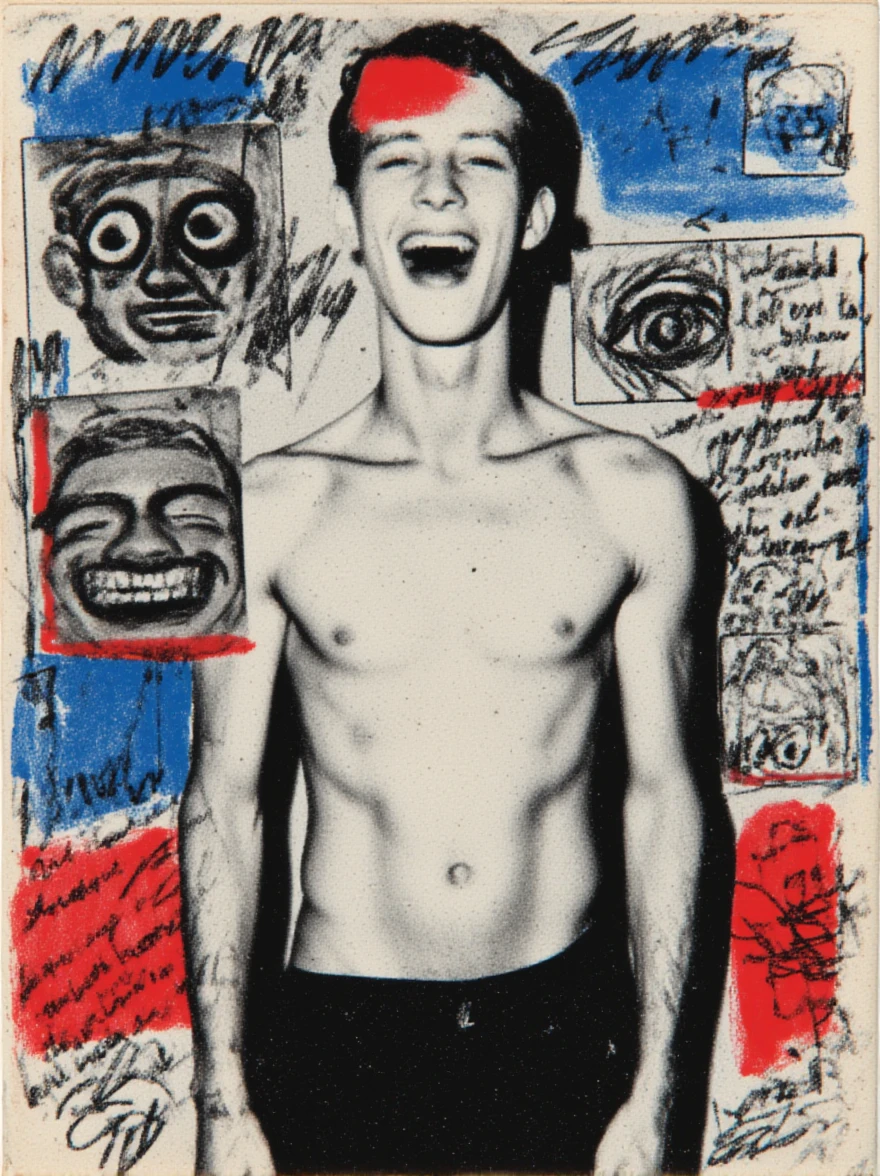 Trained on art brut mixed-media collage, combining a black and white halftone portrait with hand-drawn elements in ink or marker elements, in a surreal and raw style.