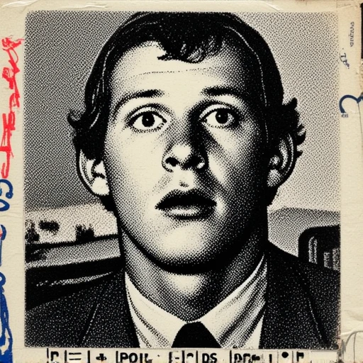 art brut mixed-media collage, combining a black and white halftone portrait with hand-drawn elements in ink or marker elements, in a surreal and raw style.