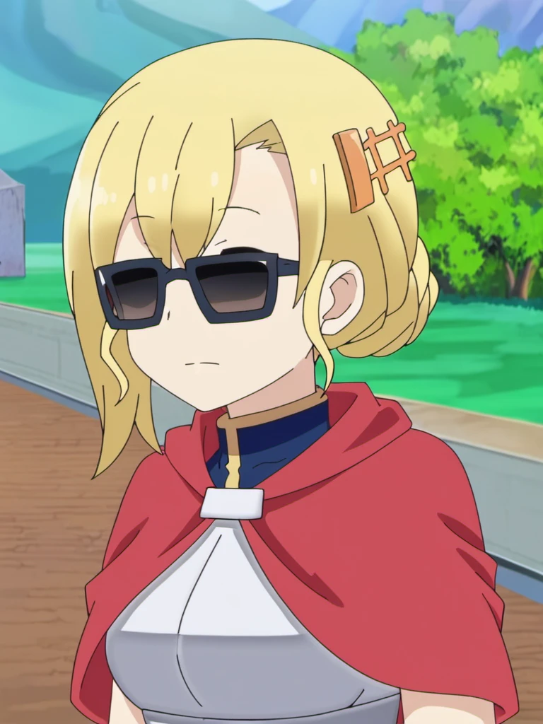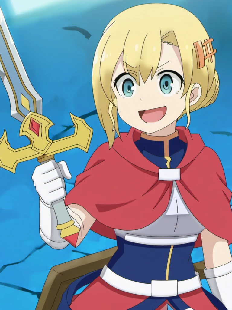 blue eyes, blonde hair, hair ornament, chest armor