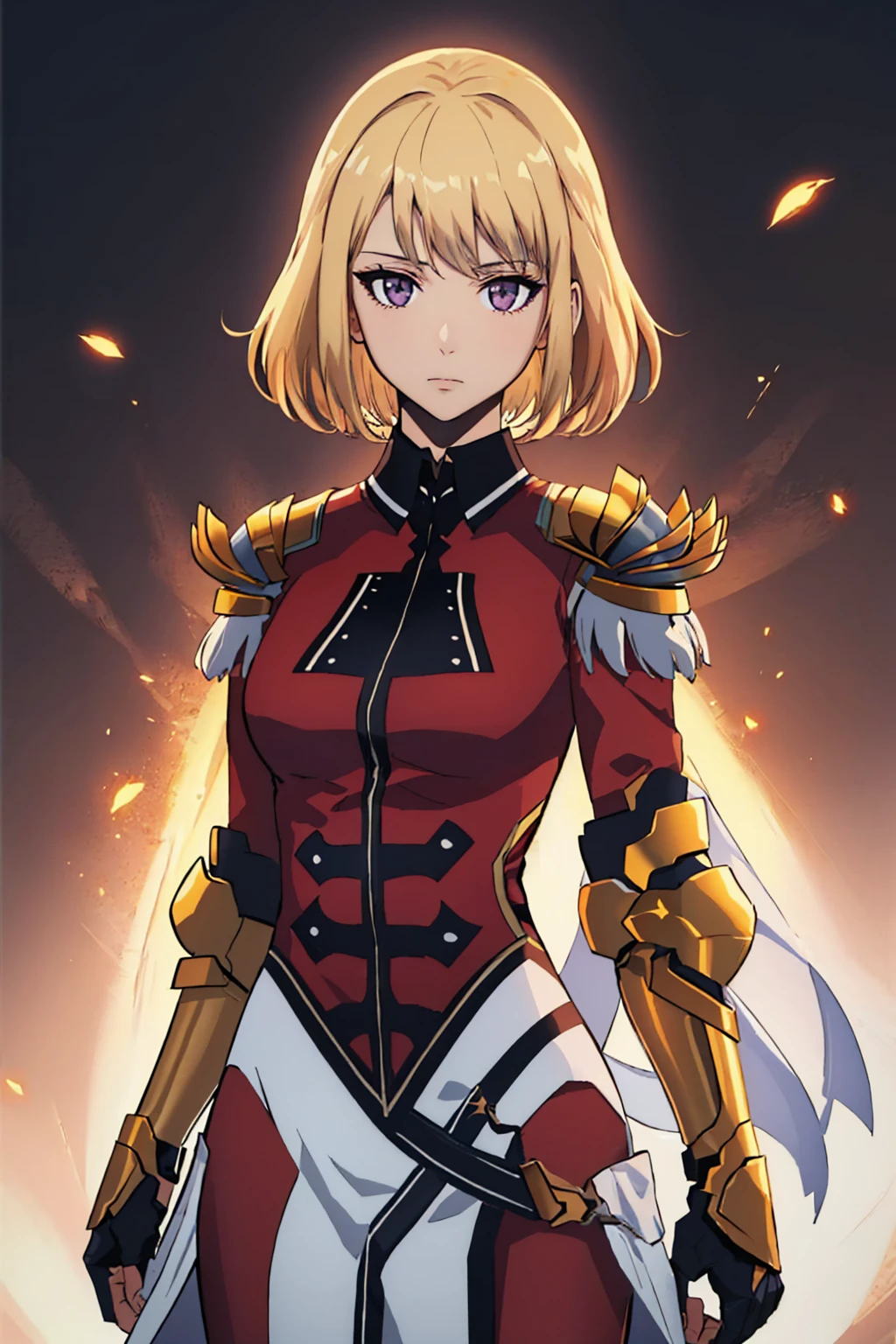 Default Outfit: armor, black collar, shoulder armor, long sleeves, gloves, gauntlets, pelvic curtain