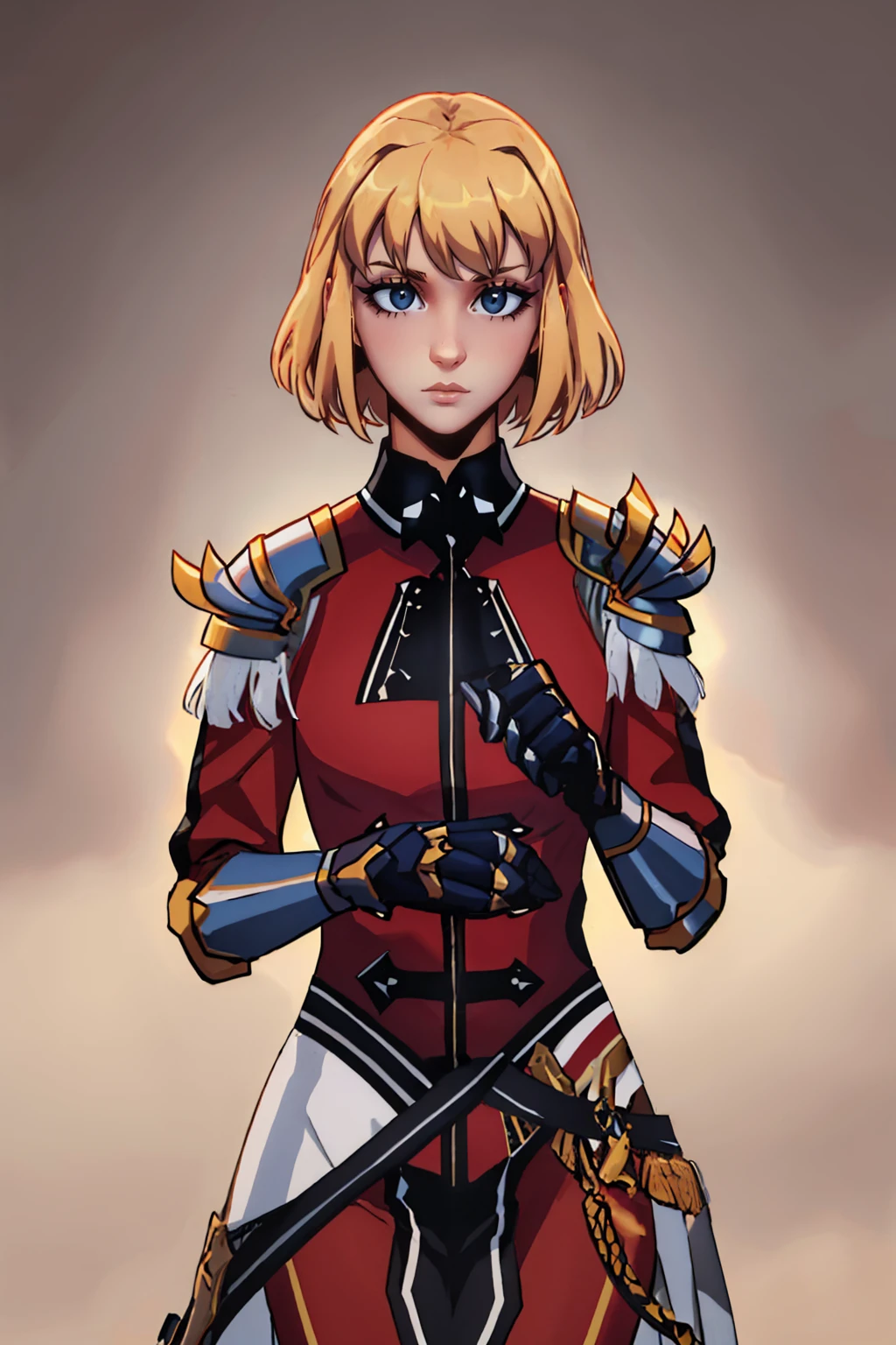 armor, black collar, shoulder armor, long sleeves, gloves, gauntlets, pelvic curtain