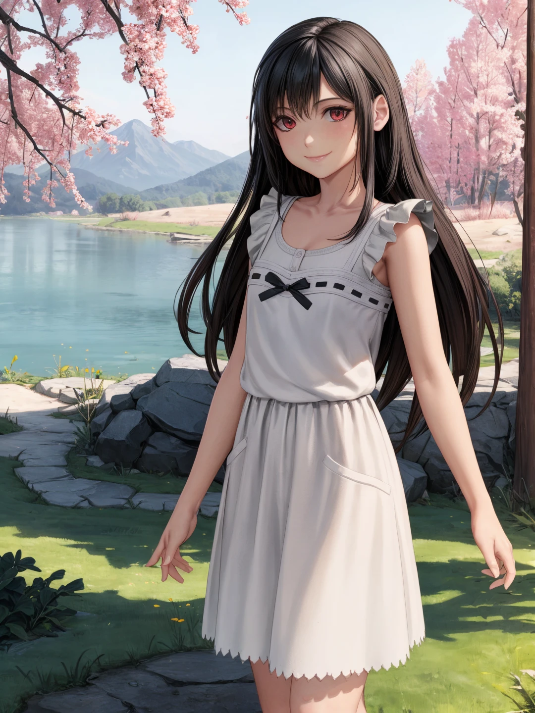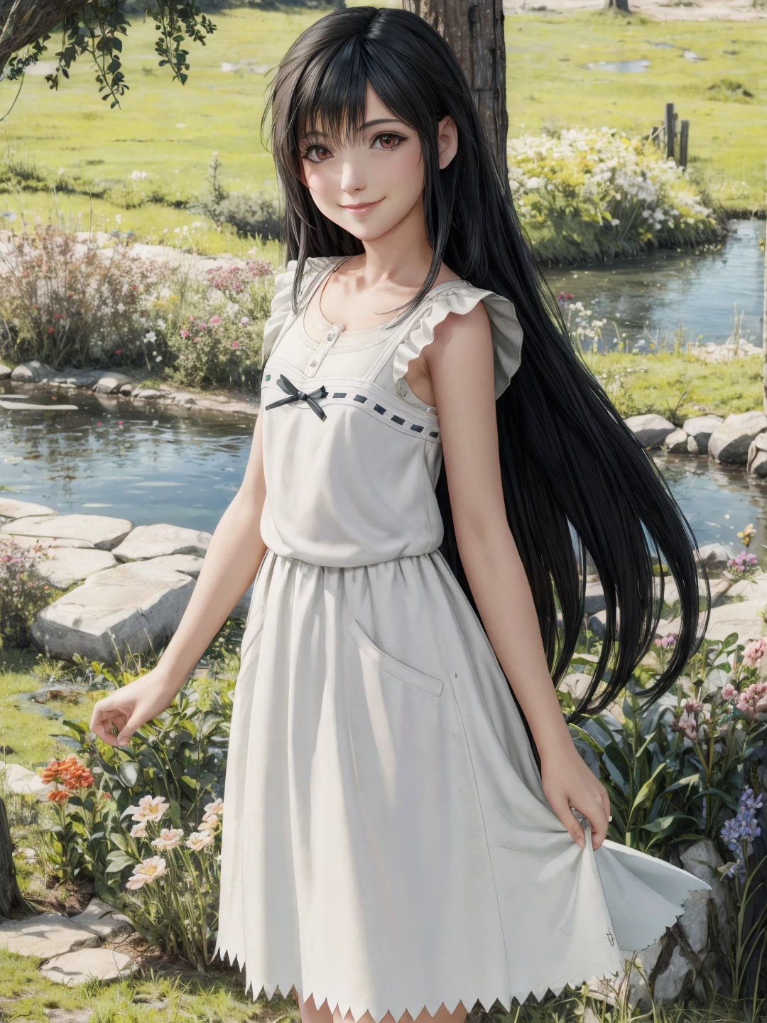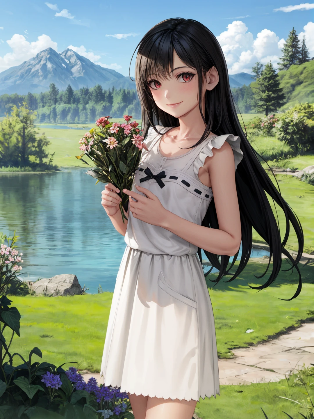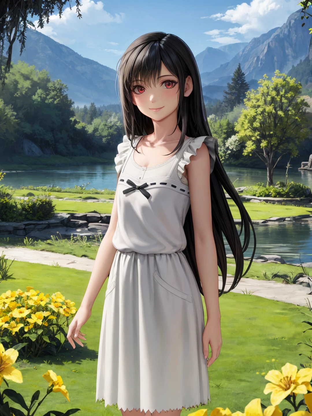 Prompts:tifa-l, red eyes, black hair, long hairwhite dress, ribbon, white skirt, white socks, sandals