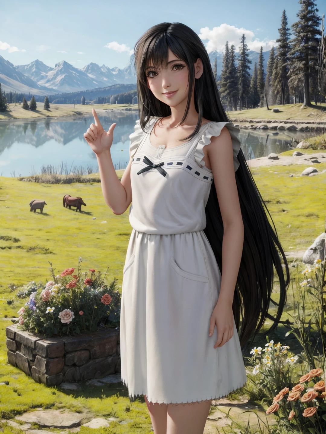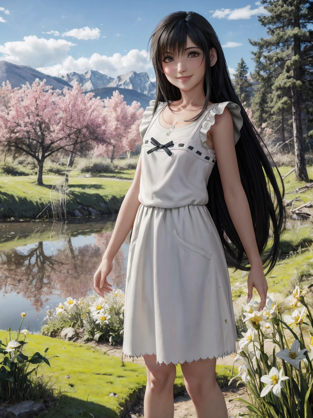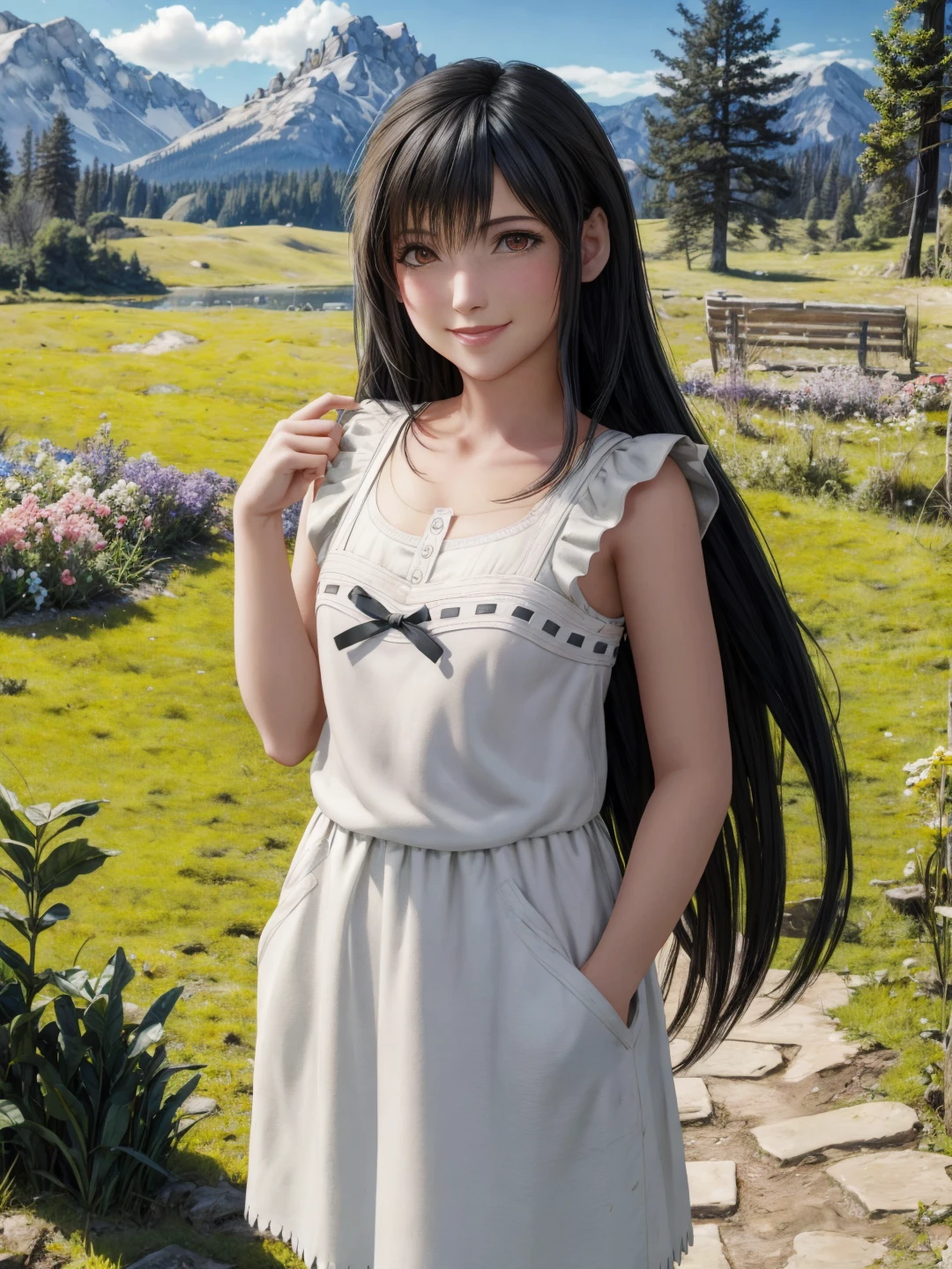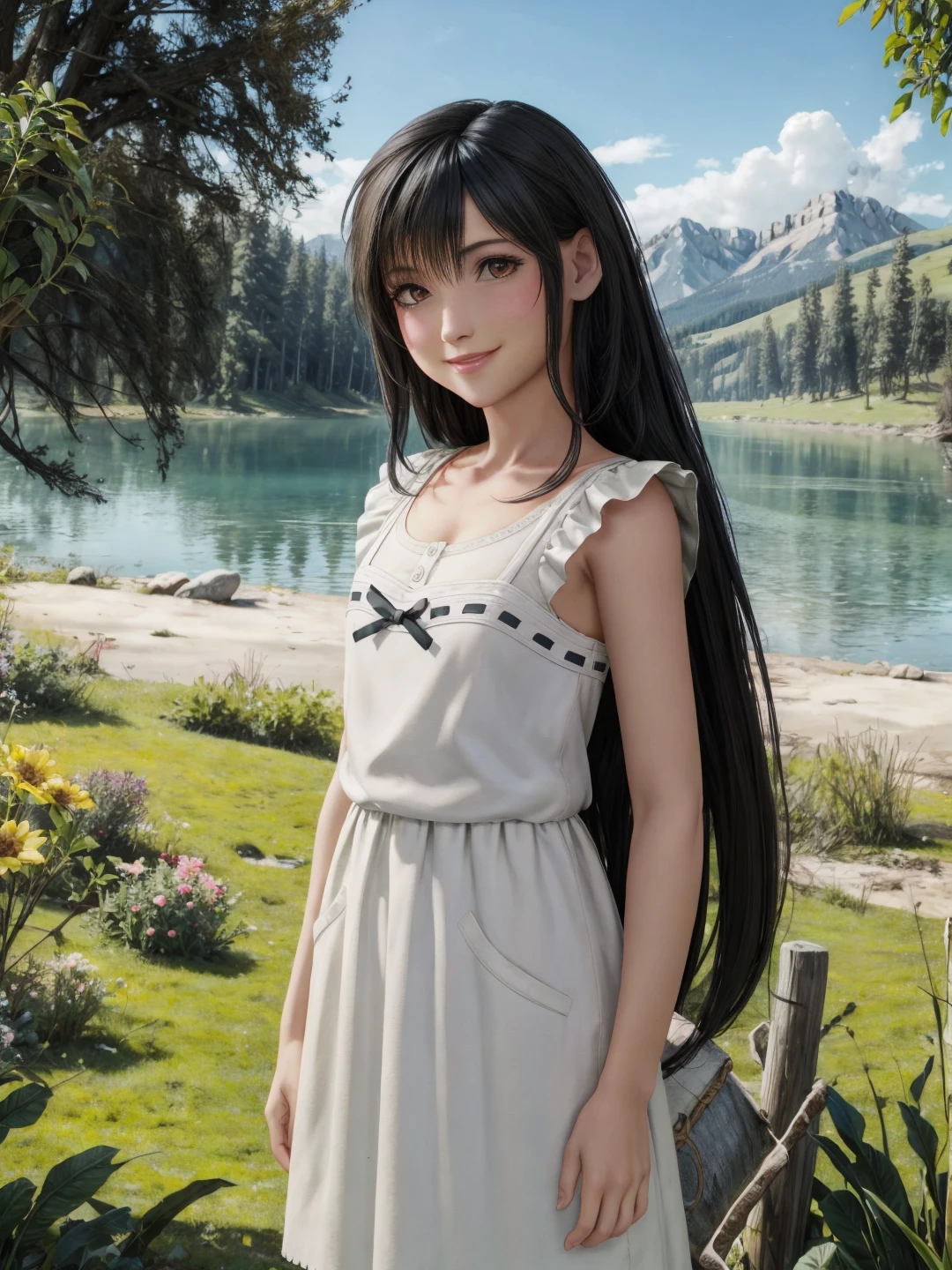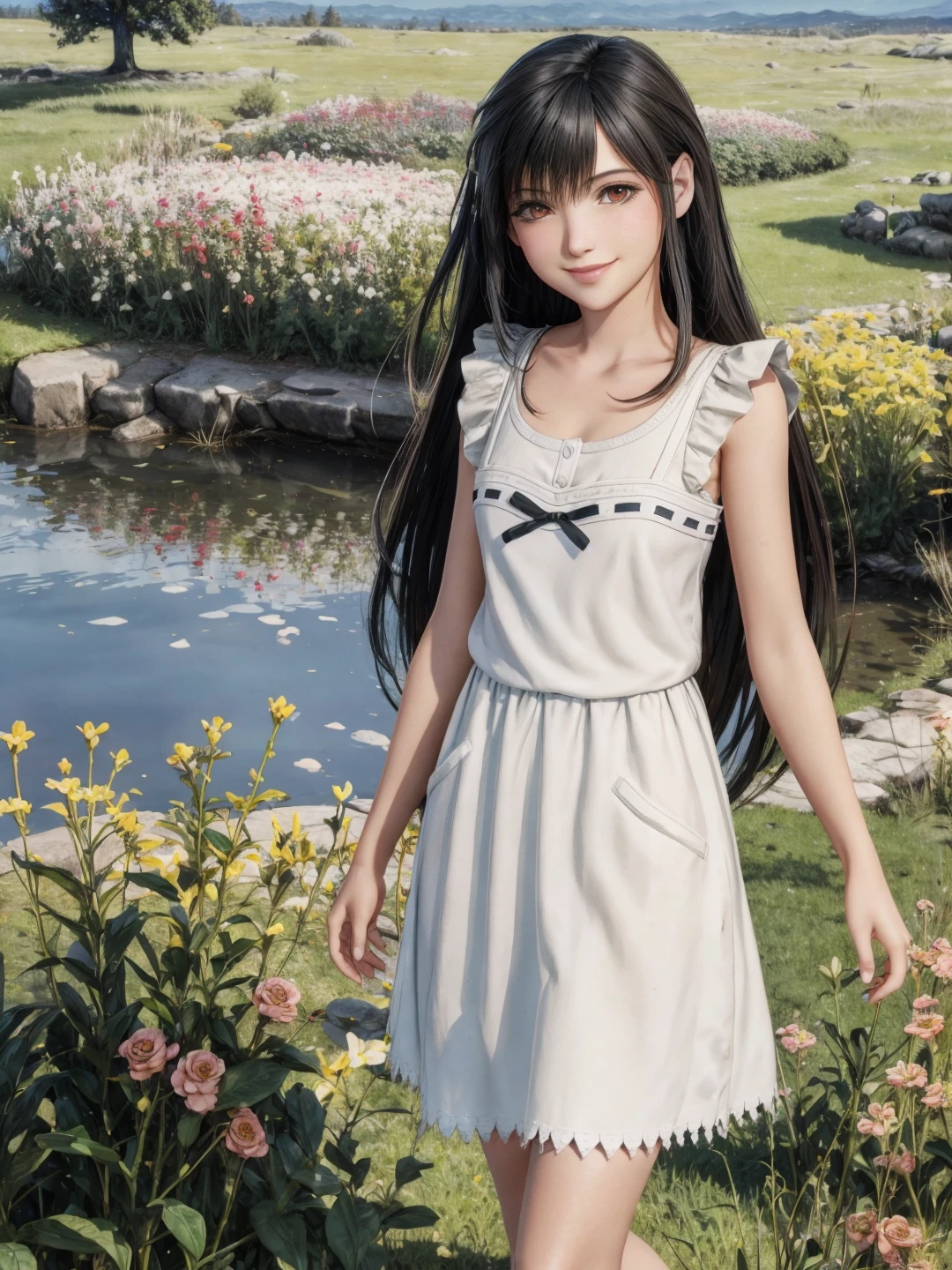 Prompts:tifa-l, red eyes, black hair, long hairwhite dress, ribbon, white skirt, white socks, sandals