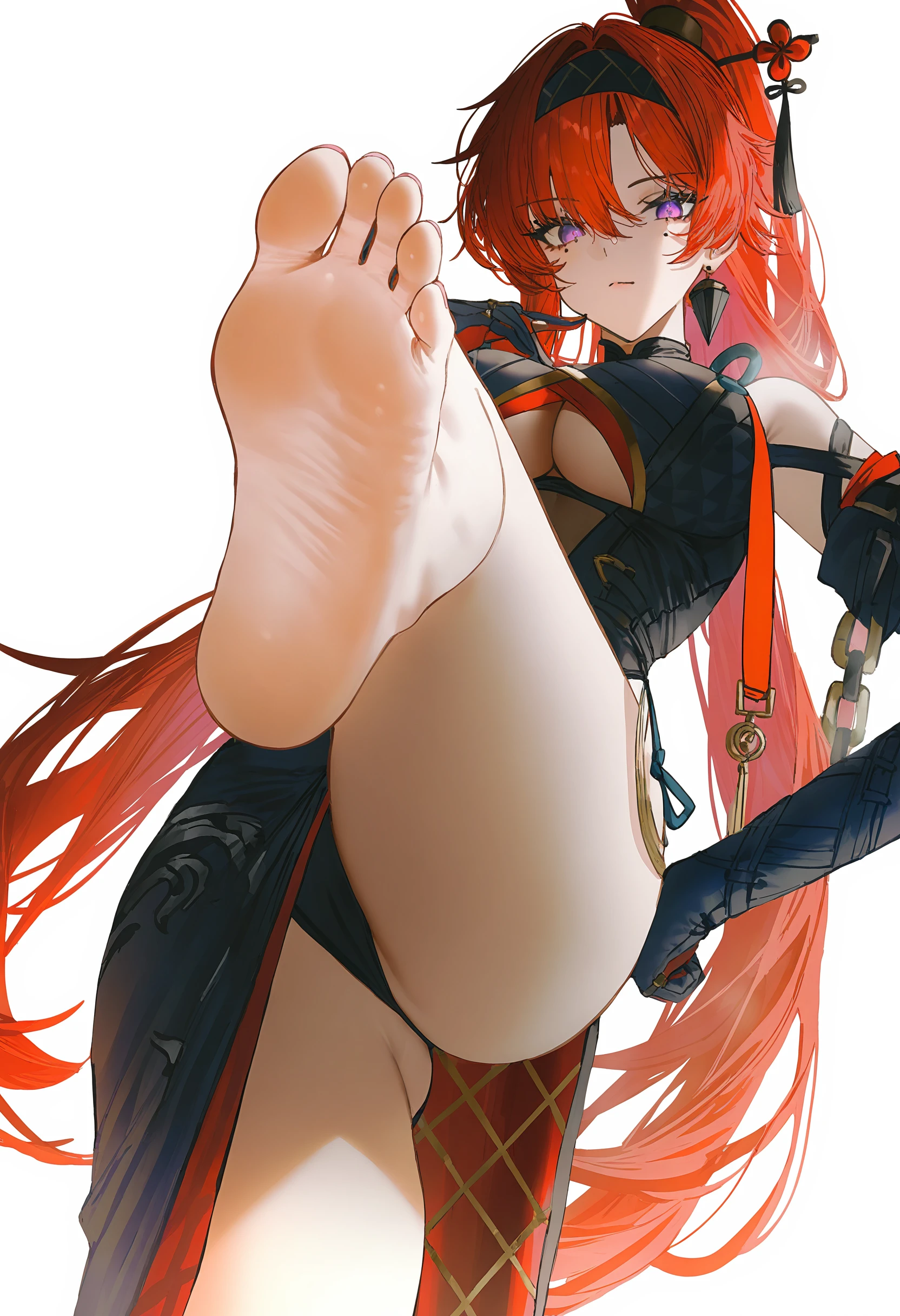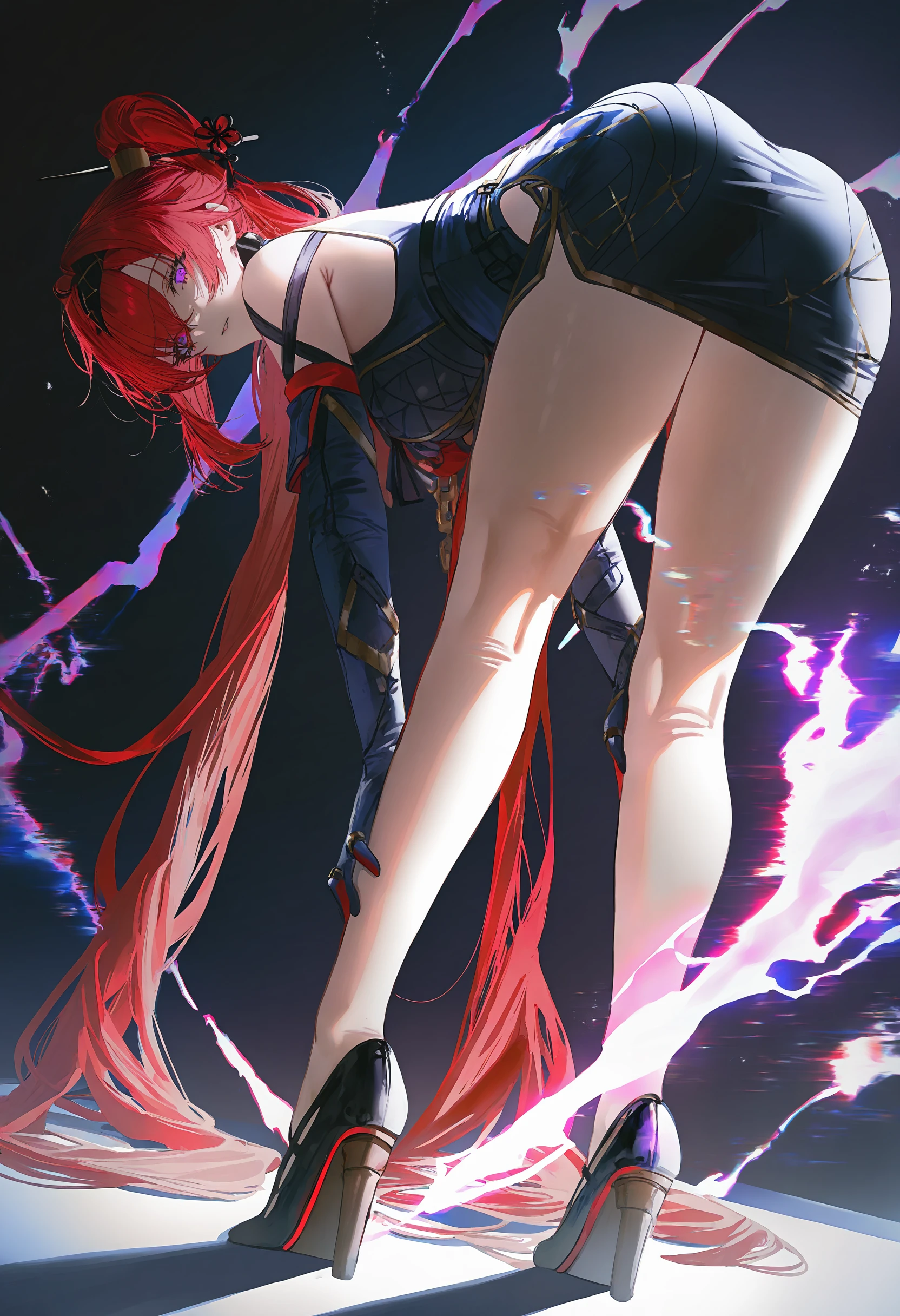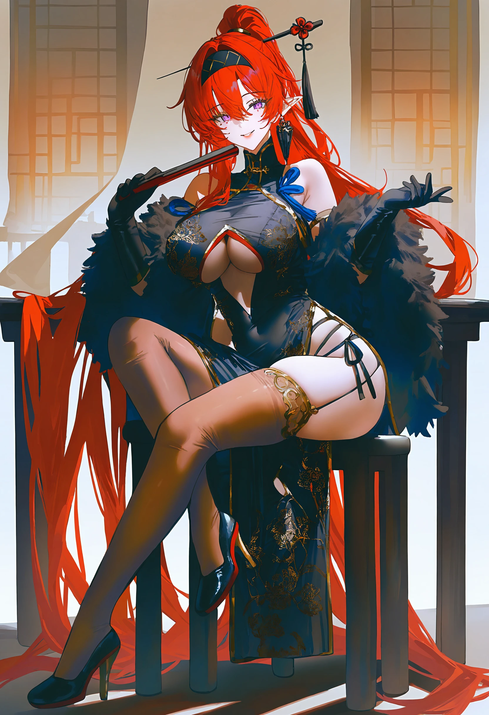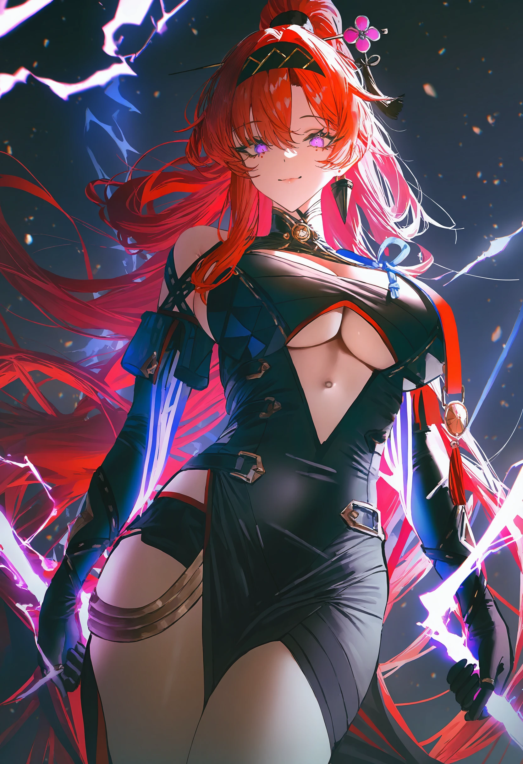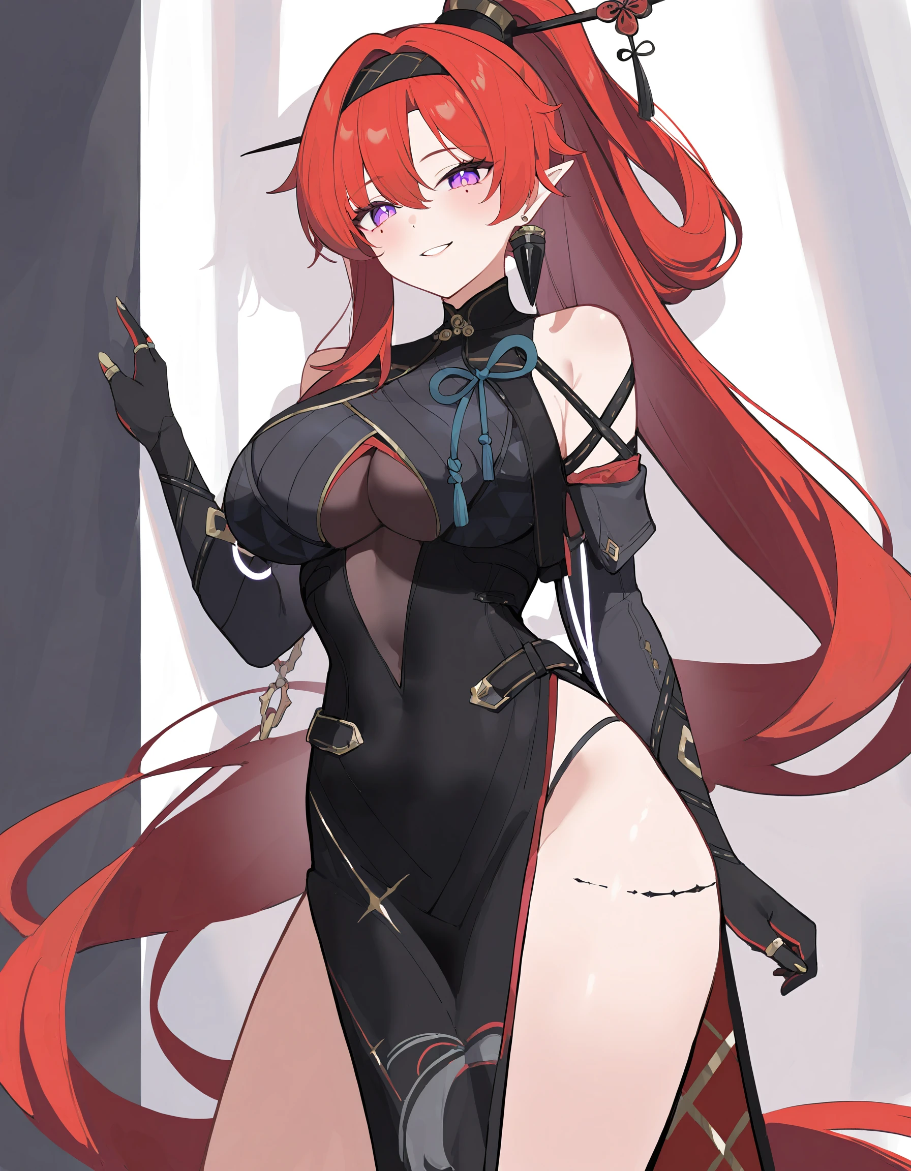 触发词: very long hair, red hair, looking at viewer, 1girl, purple eyes, solo, ponytail, hair ornament, gloves, mole, bare shoulders, black dress, jewelry, smile, earrings, black hairband, pointy ears,standing