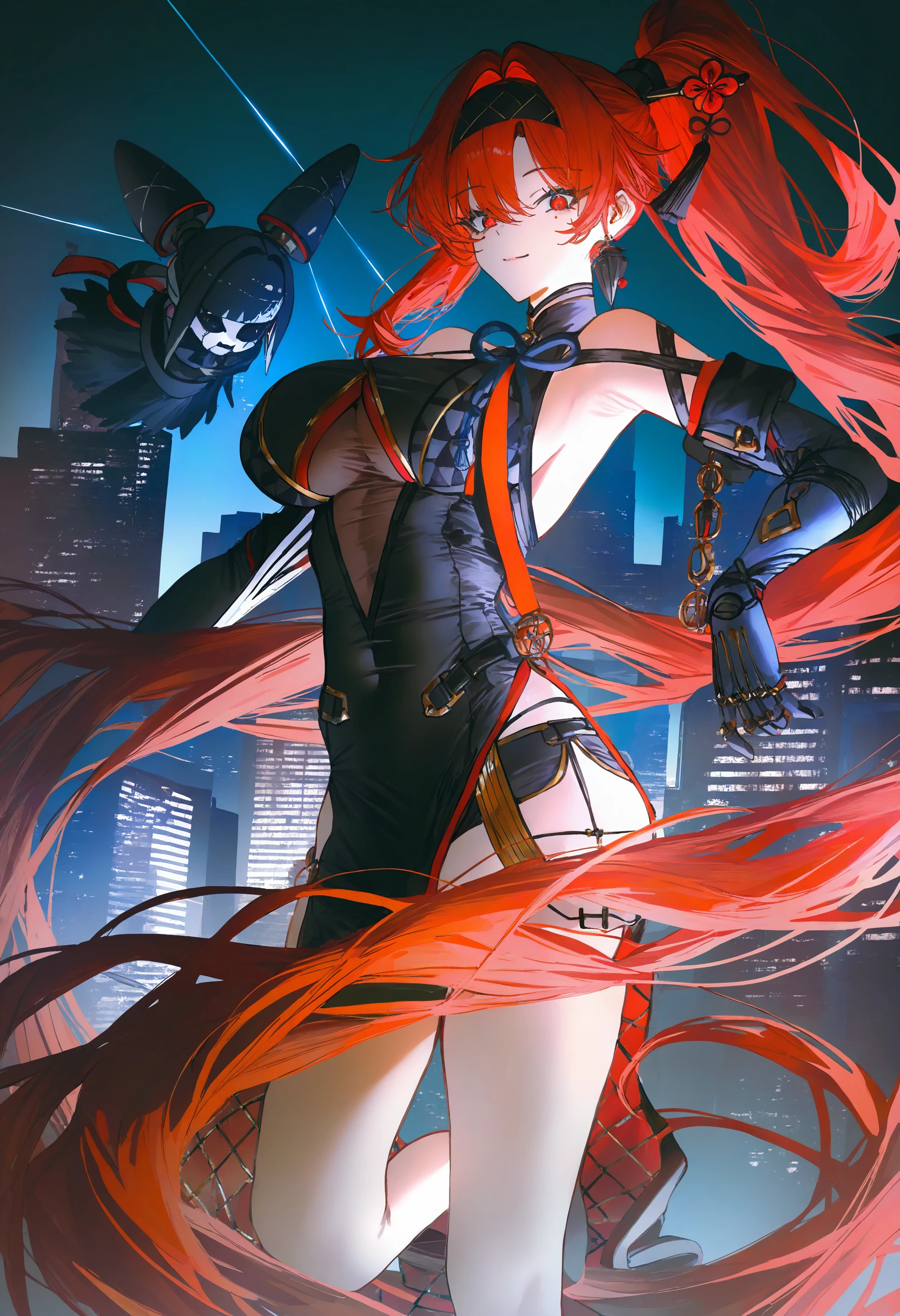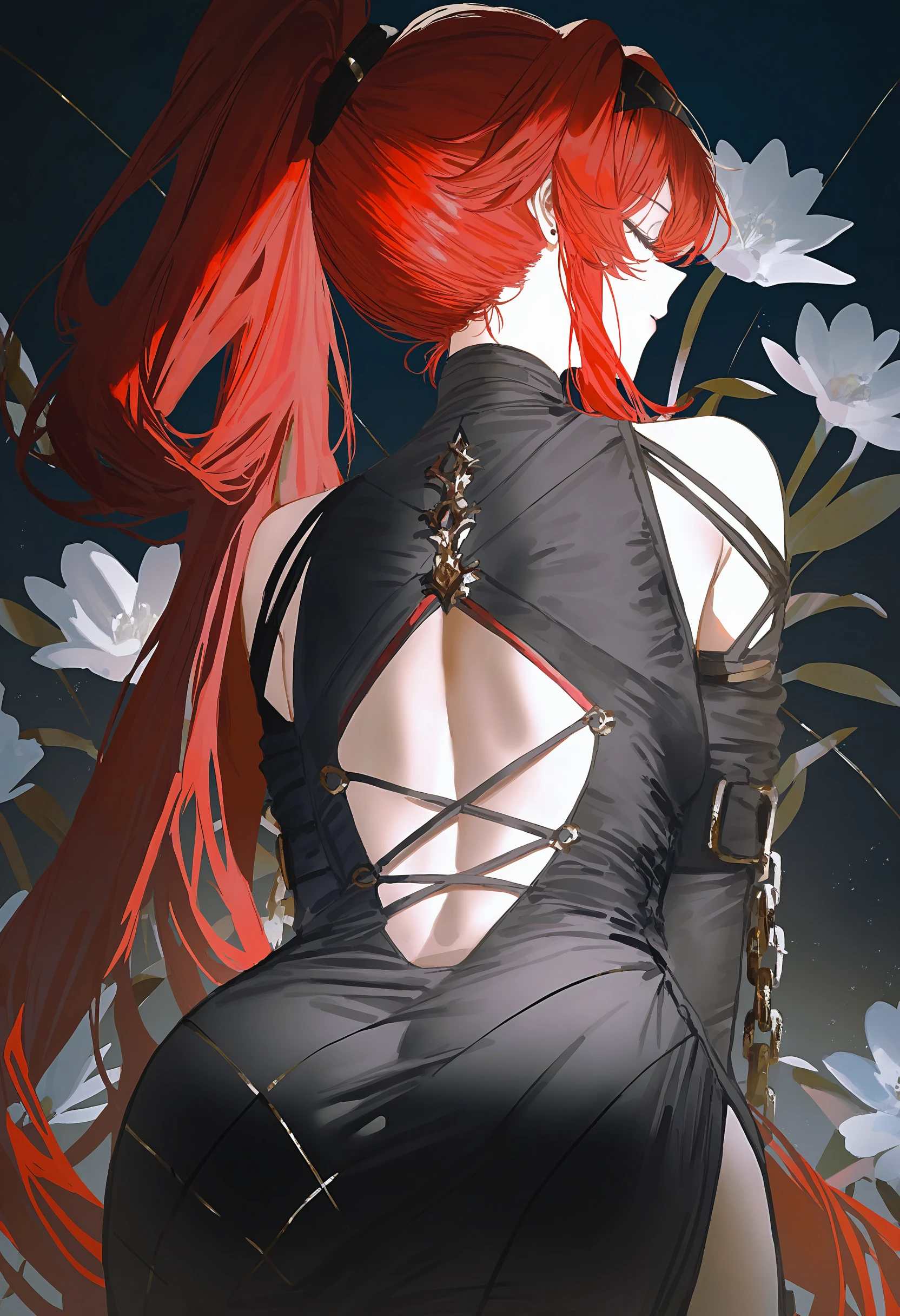 触发词: red hair, looking at viewer, 1girl, purple eyes, solo, ponytail, hair ornament, very long hair, gloves, mole, bare shoulders, black dress, jewelry, smile, earrings, black hairband, pointy ears,standing