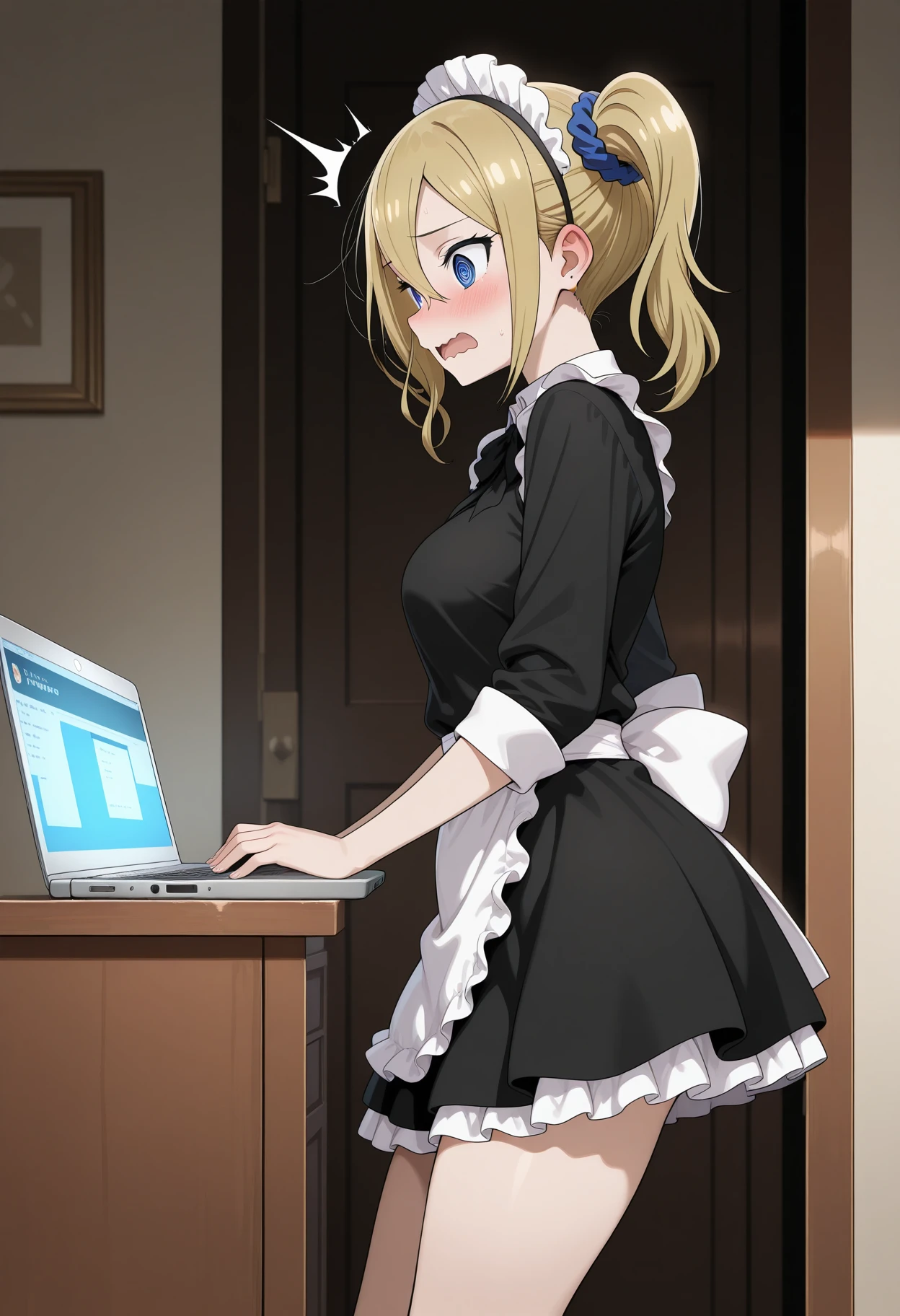 secret masturbation, 1girl, female masturbation, laptop, from side, standing