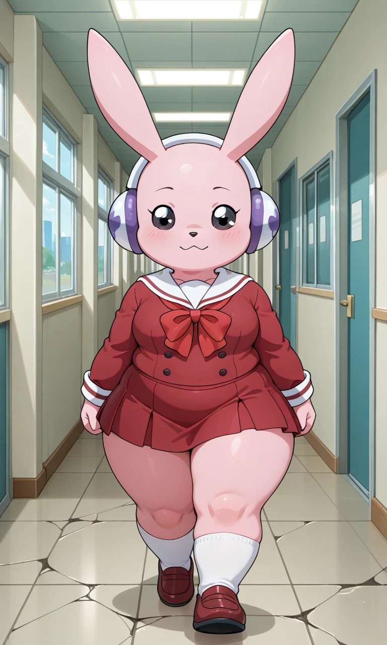 prompts: Cutemon_(Digimon), anthro digimon, pink fur, black eyes, long ears, white headphones, red scarf