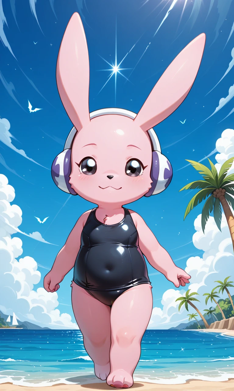 Cutemon_(Digimon), anthro digimon, pink fur, black eyes, long ears, white headphones, red scarf