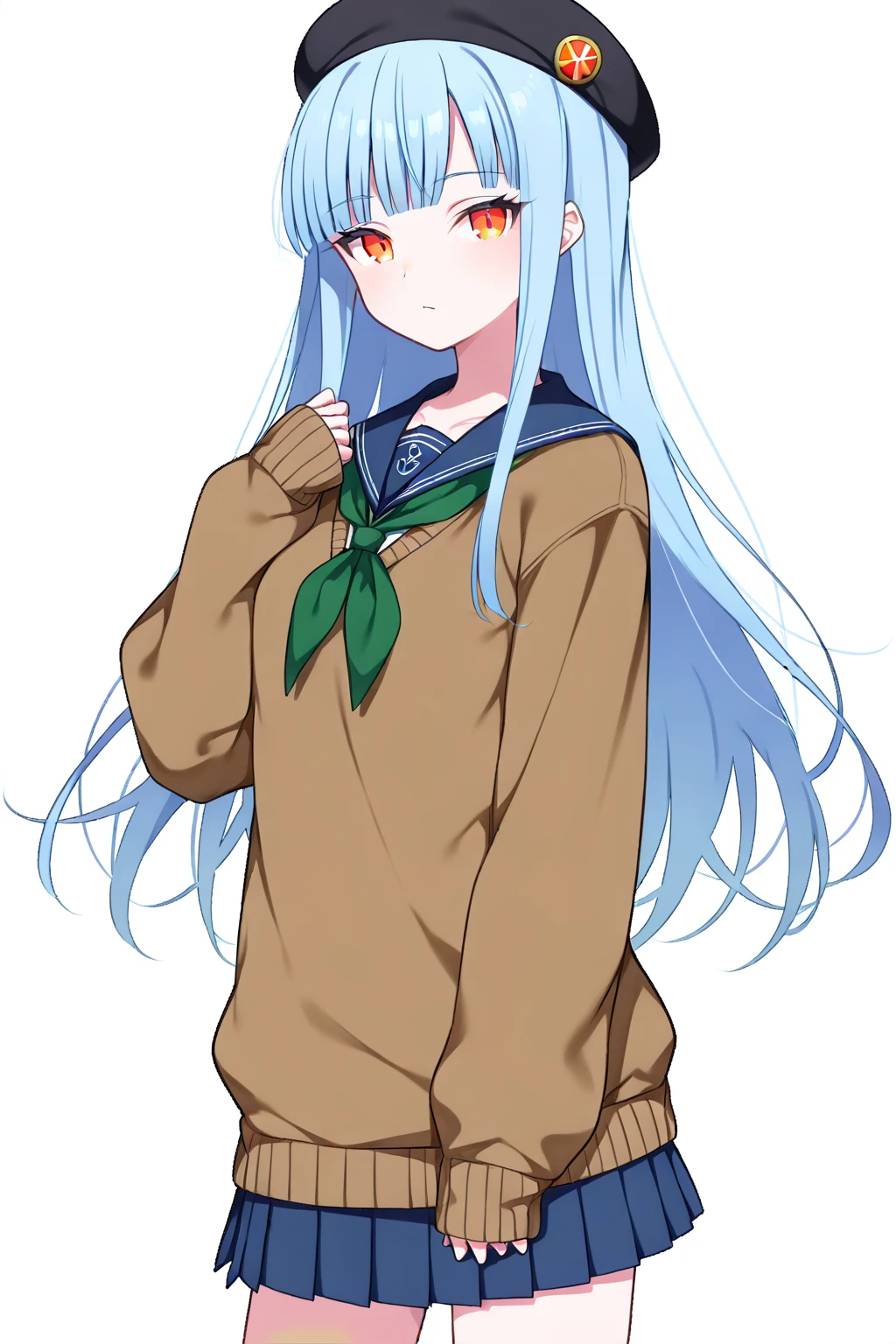 aya(NTR Island), 1girl, long hair, skirt, blue hair, school uniform, hat, orange eyes, pleated skirt, serafuku, beret, bangs, sailor collar, sleeves past wrists, black headwear, long sleeves, neckerchief, blue skirt, sweater, green_neckerchiefRecommend preferred Strength: 0.8