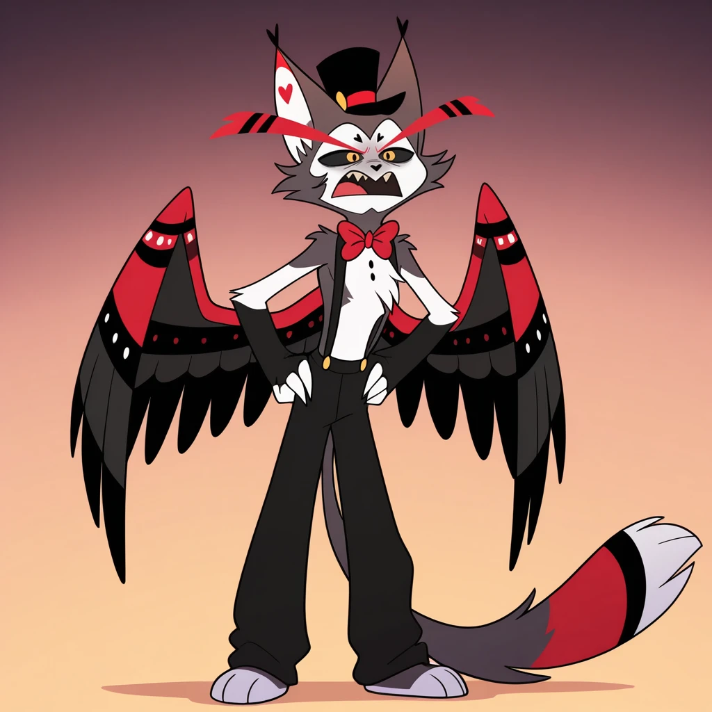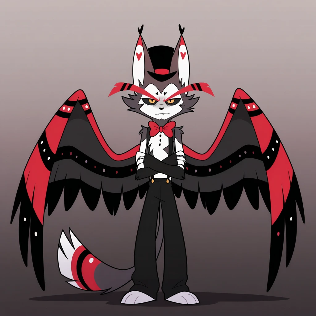1boy, male, furry, anthro, cat, solo, grey fur, white fur, two-tone fur, black sclera, yellow eyes, long eyebrows, forehead marks, black nose, sharp teeth, pointed ears, colored inner ears, sharp claws, two dots on chest, pawpads, tail, tailfeather, red and black wings, barefoot