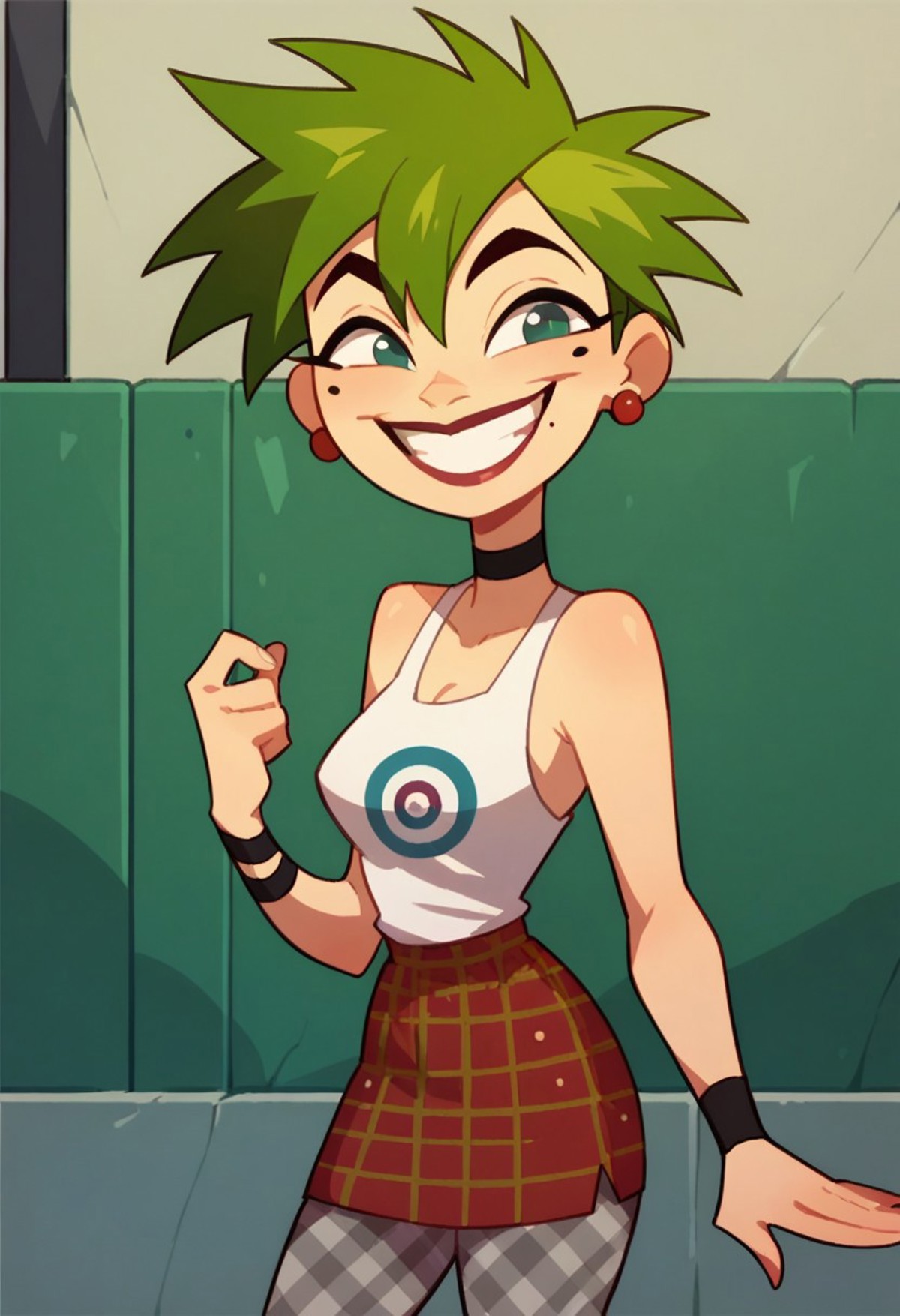 tuesday x, green hair, earrings, chocker, wristband, white tank top, plaid skirt, plaid thighhighs