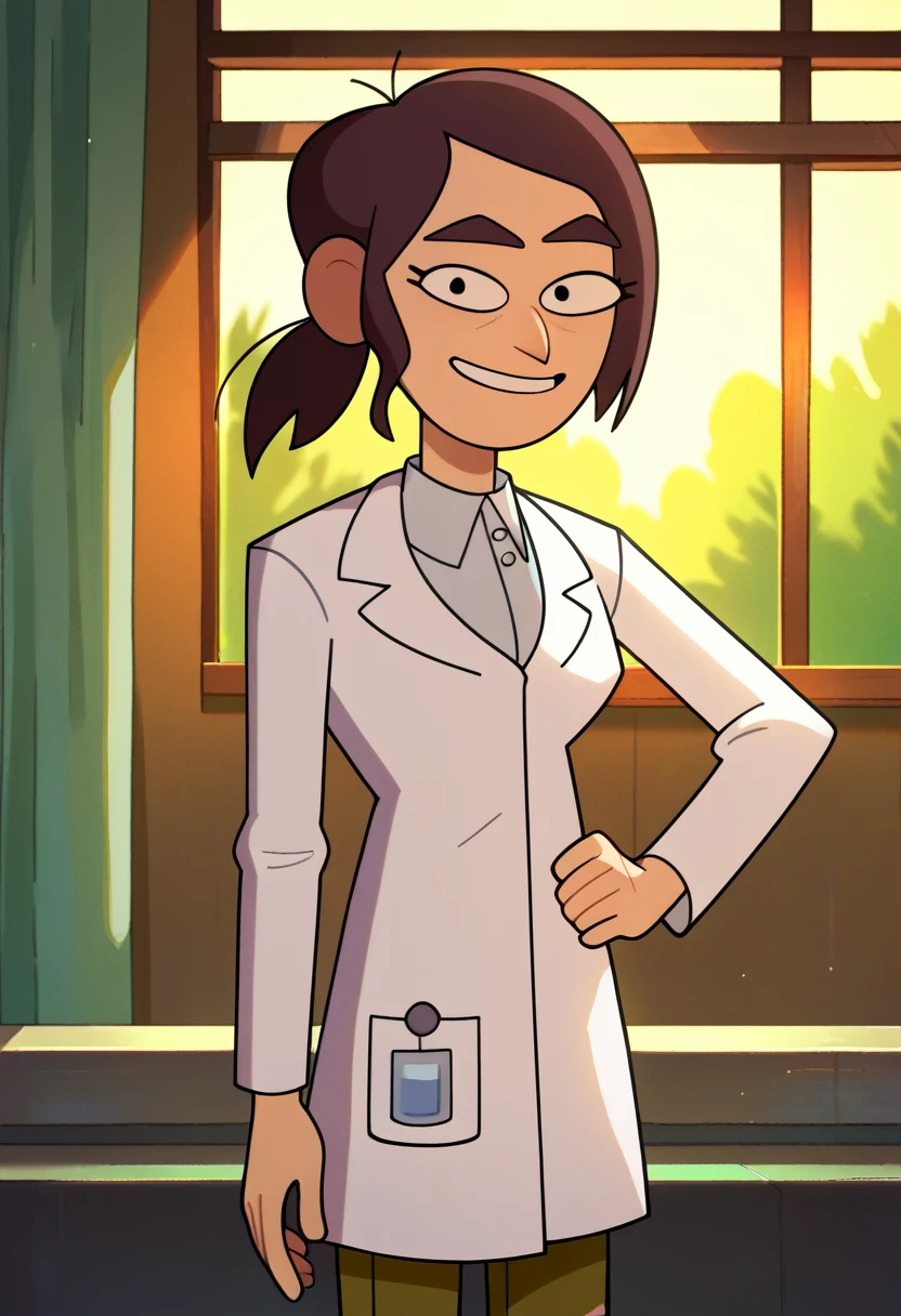 reaganij, 1girl, short ponytail, solo, brown hair, labcoat, grey shirt,white footwear, green pants