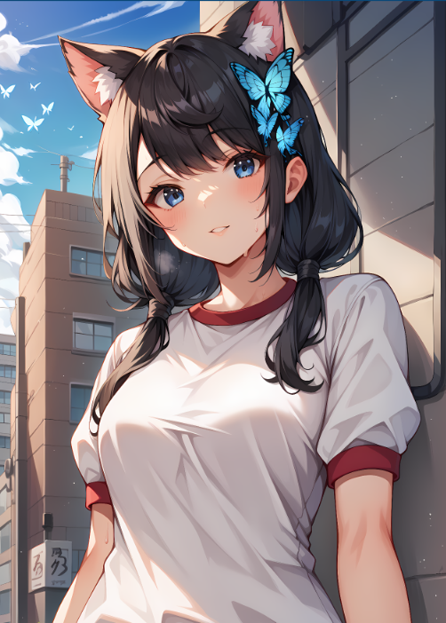 fusou, blue eyes, black hair, long hair, sidelocks, low twintails, cat ears, butterfly hair ornament, hair bow