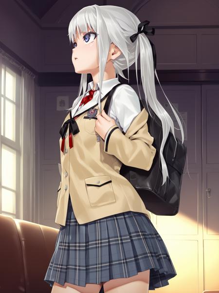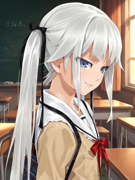 - School uniform: blue eyes, twintails, hair ribbon, black ribbon, school uniform, plaid skirt