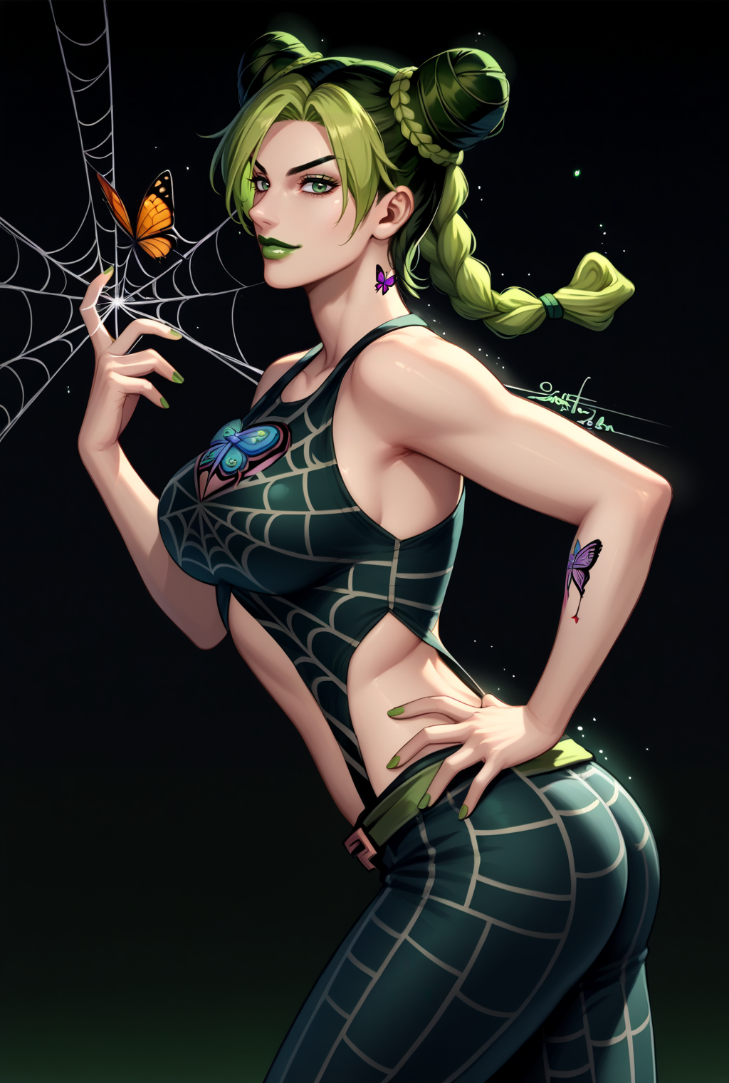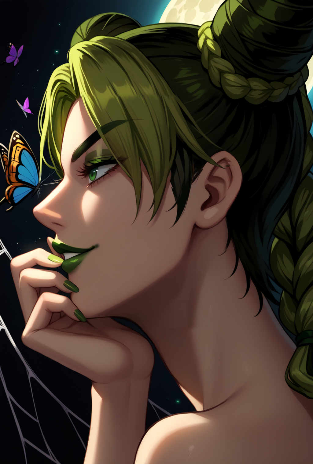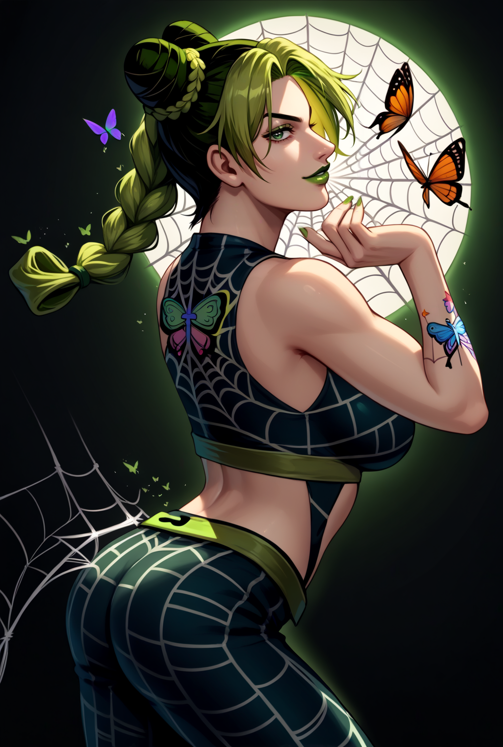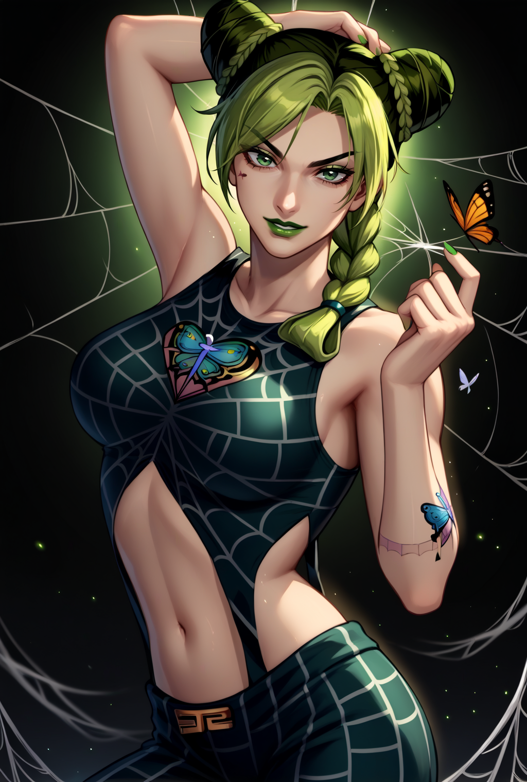 kjolyne, green eyes, two-tone hair, green hair, black hair, double bun, braided bun, braided ponytail, green lips, lipstick, make up, green nails, nail polish, spider web print, midriff