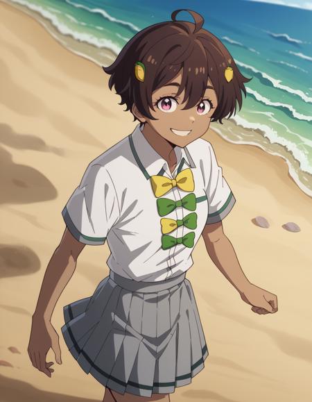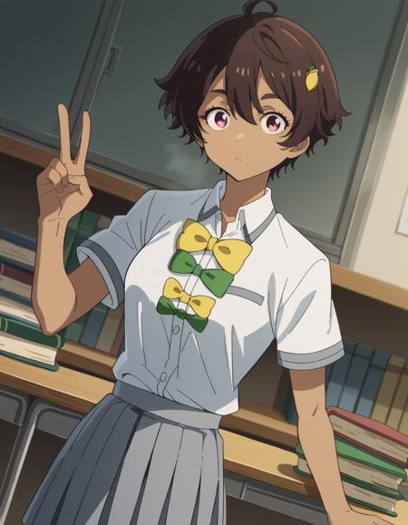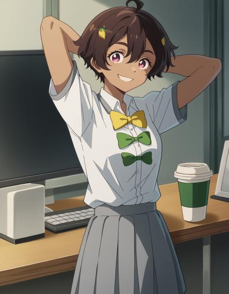 Score_9, Score_8_up, Score_7_up, source_anime, Lemonyakishio, <lora:lemon-yakishio-s1-ponyxl-lora-nochekaiser:1>, Lemonyakishio, short hair, brown hair, ahoge, pink eyes, hair clip, hair between the eyes , dark skin, dark-skinned woman, skirt, shirt, bow, school uniform, white shirt, short sleeves, pleated skirt, bow tie, yellow bow, gray skirt, yellow bow tie, green bow, green bow tie, home office, work from home, computer screen, coffee cup, attention, deadline, smile, hands behind head, alone, cowboy shot, dutch angle