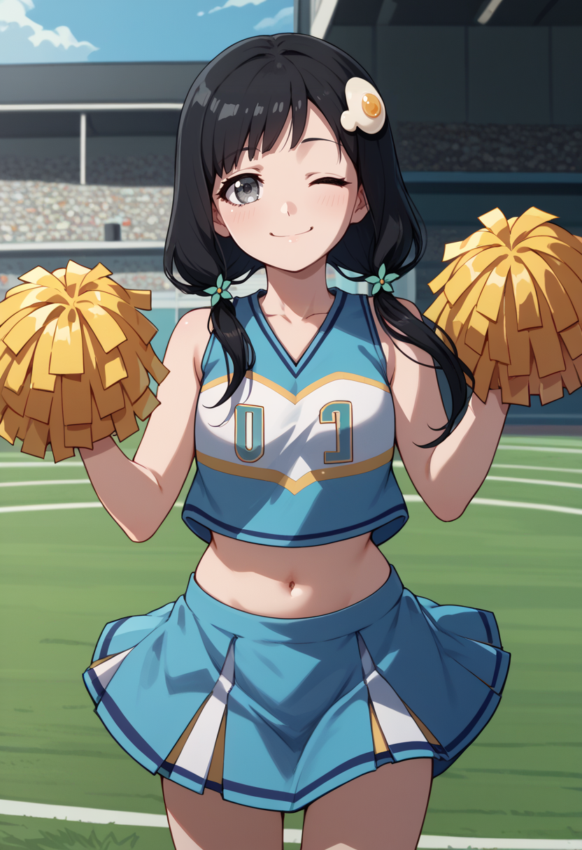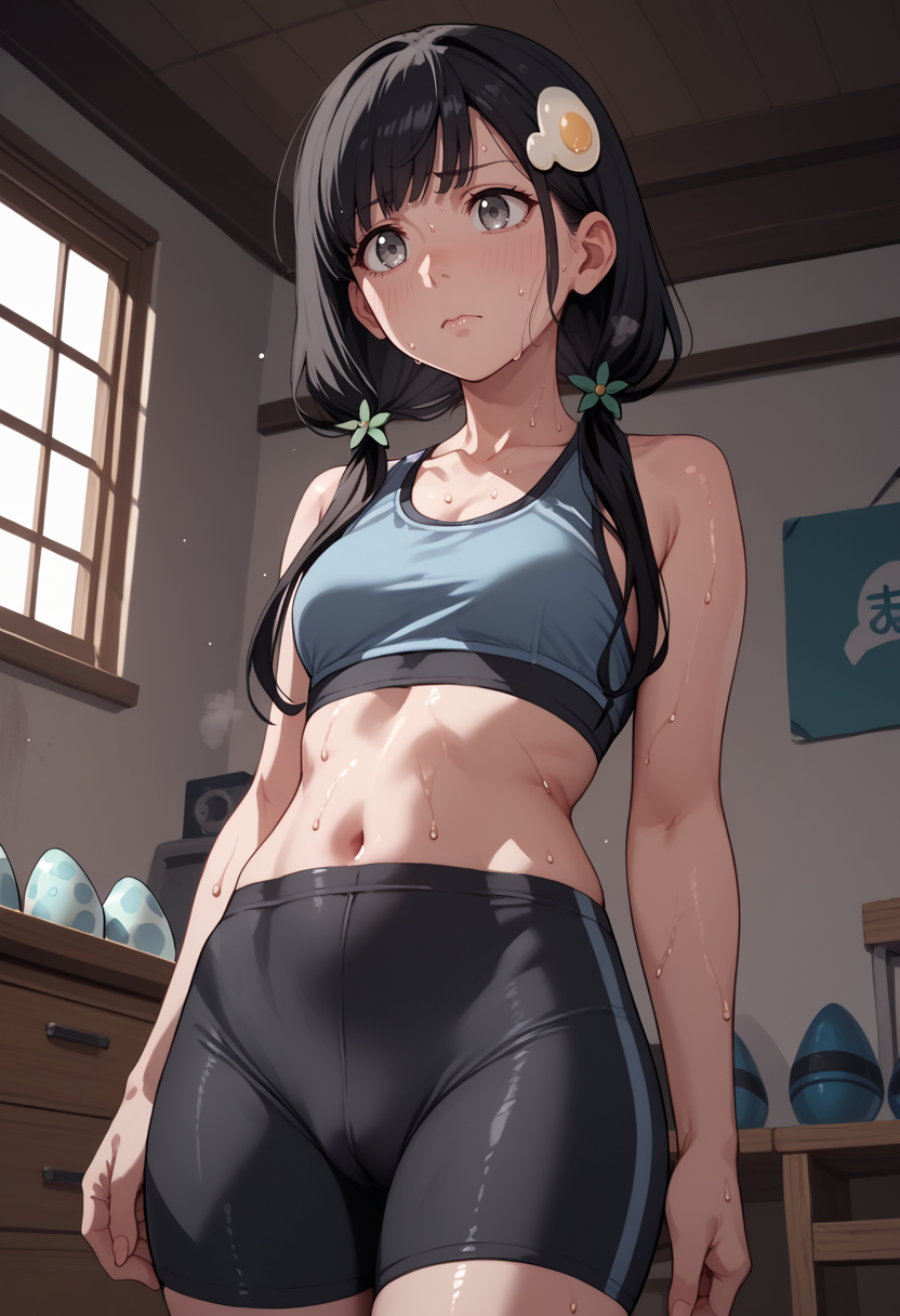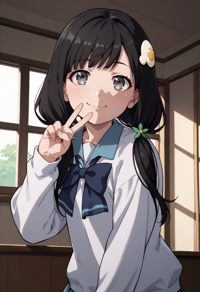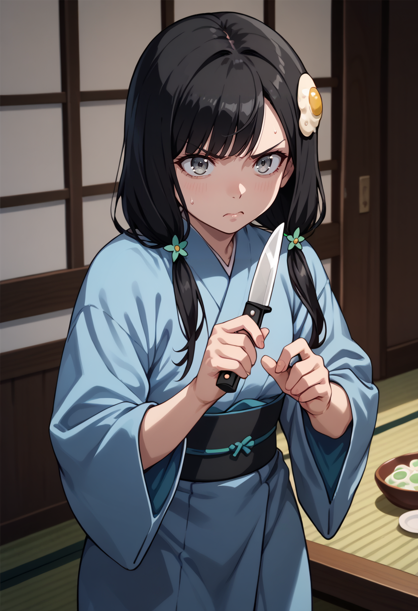 offtsukihi, black hair, grey eyes, low twintails, egg hair ornament,small breasts