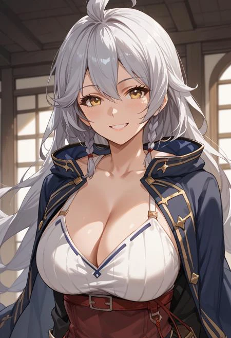 Silva, Long Hair, White hair, Yellow Eyes, Large Breasts, Ahoge, Braid, Side Braid,