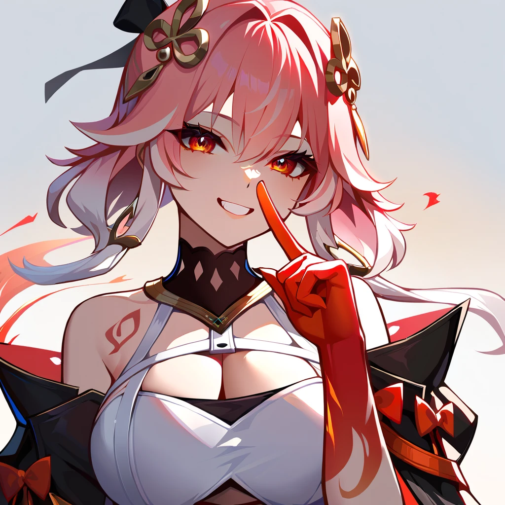 changli,solo,pink hair,ponytail,gradient hair,hair ornament,multicolored hair,yellow eyes,symmetrical glove, red left glove,