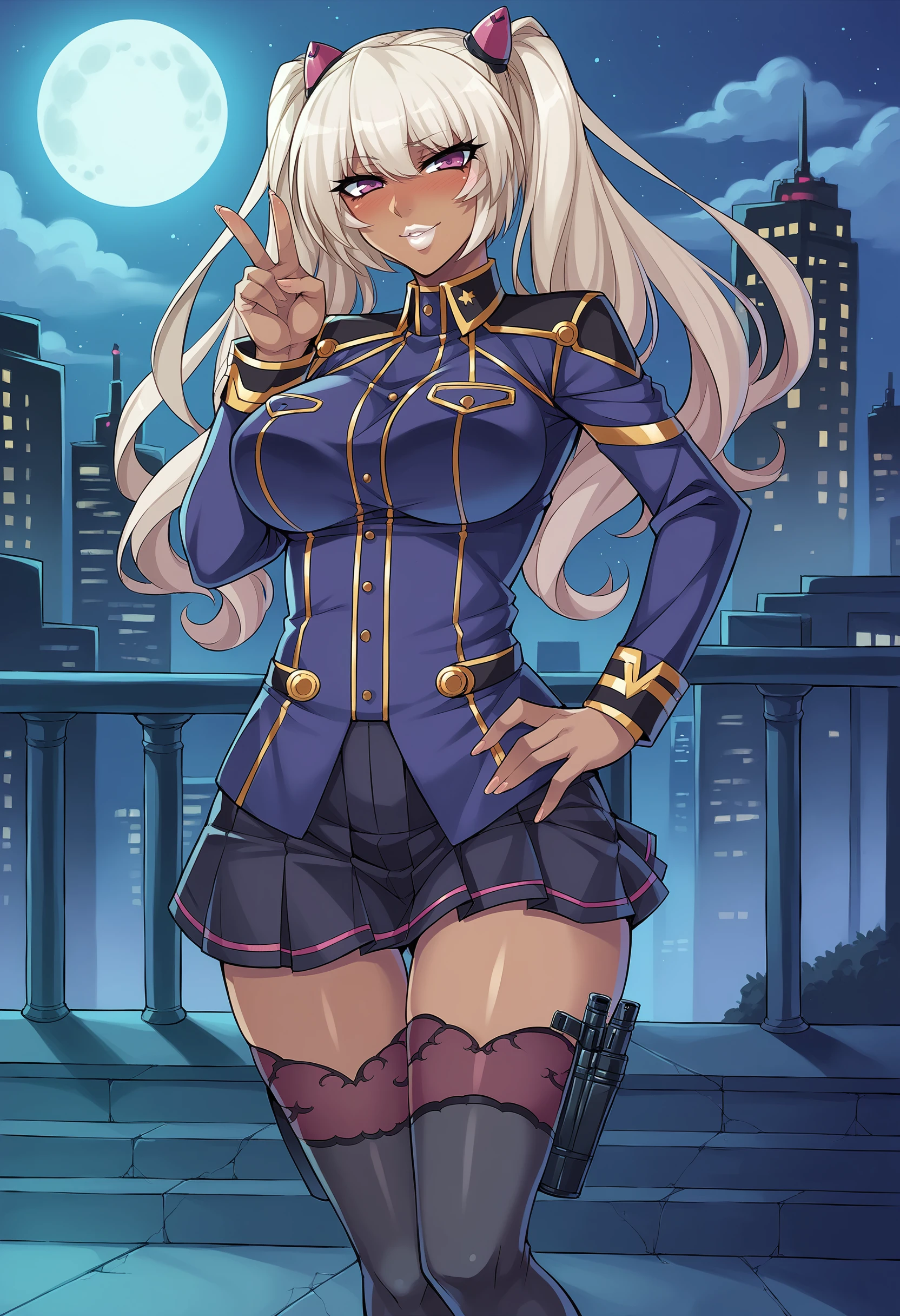 military uniform, pleated skirt, lace-trimmed thighhighs, high heel boots, thigh holster,