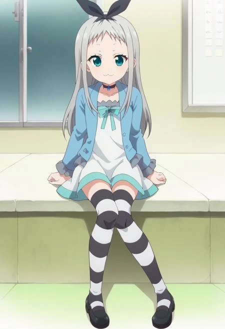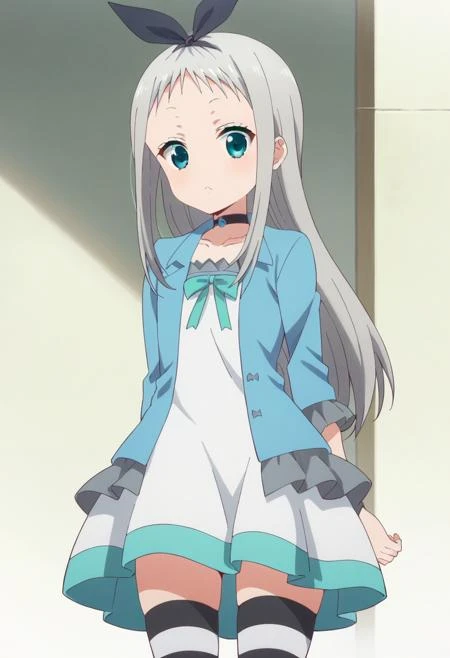 Casual Outfit - white dress, skirt, bow, ribbon, black hairbow, choker, striped, zettai ryouiki, cosplay, otoko no ko, striped thighhighs, blue jacket, open jacket,
