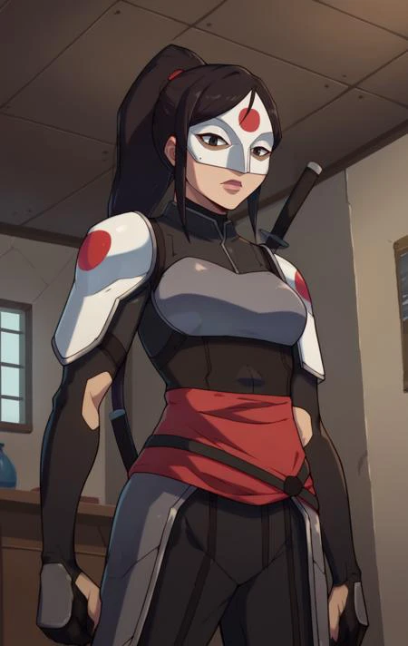 YoungJusticeKatanaMarlo,1girl,black eyes,long hair,black hair,gloves,ponytail,armor,mask,weapon on back