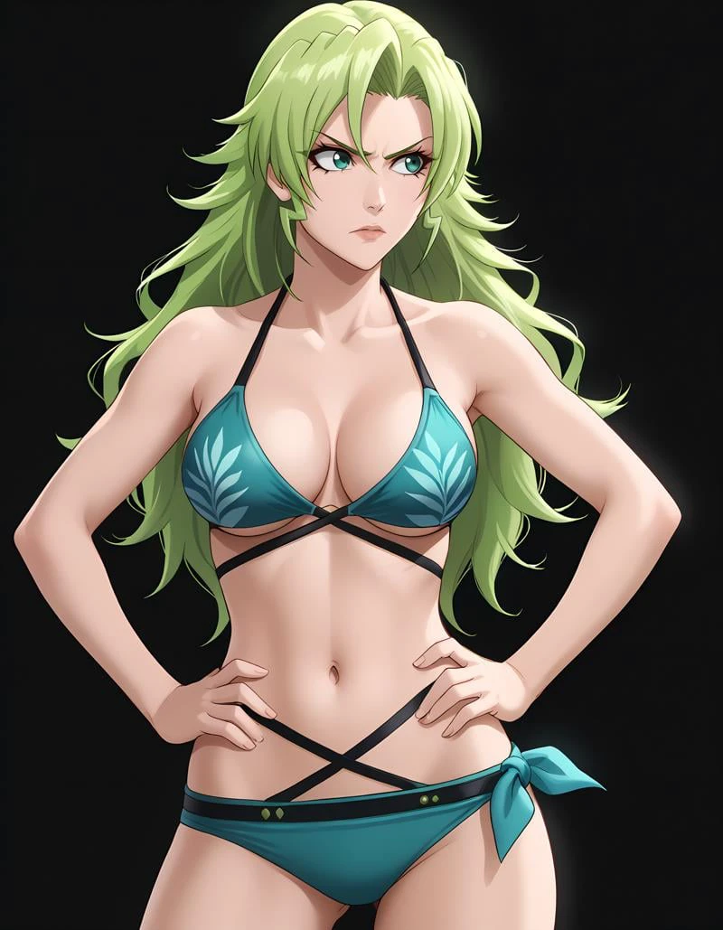 candice_catnipp, green hair, green eyes, long hair, hair between eyes