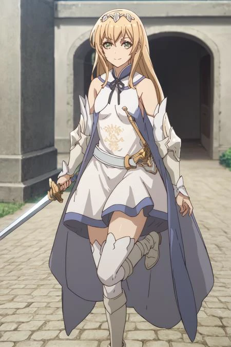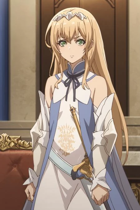princess, long_hair, green_eyes, blonde_hair, headwear, sword,
