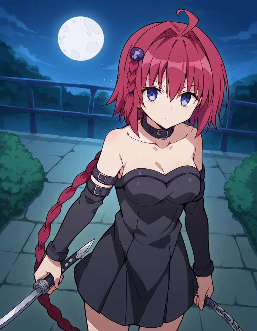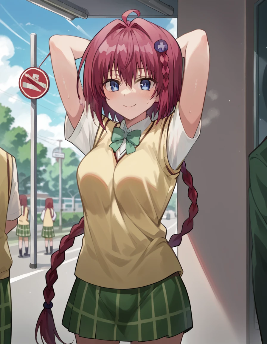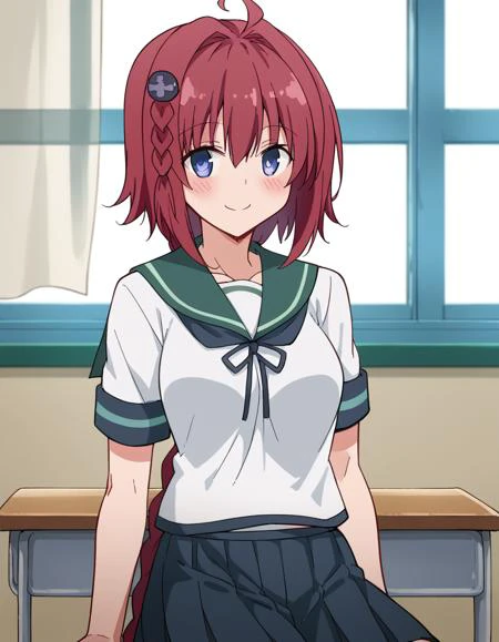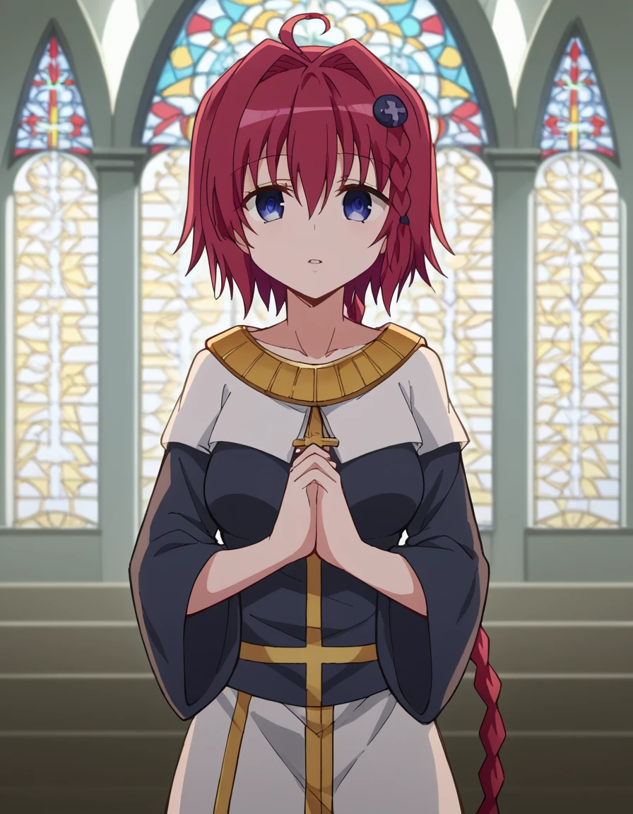 mea kurosaki, ahoge, blue eyes, braid, hair intakes, hair ornament, long hair, red hair, hair braid, medium breasts