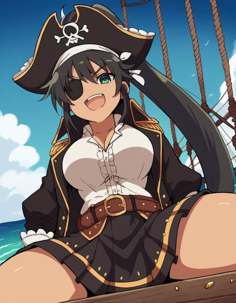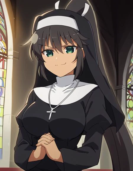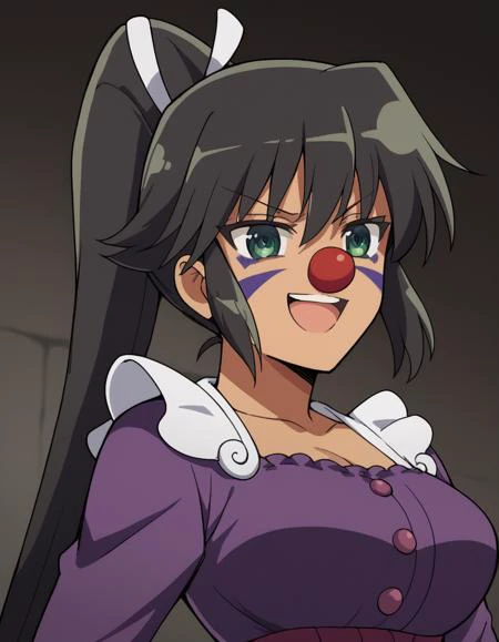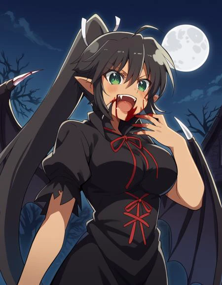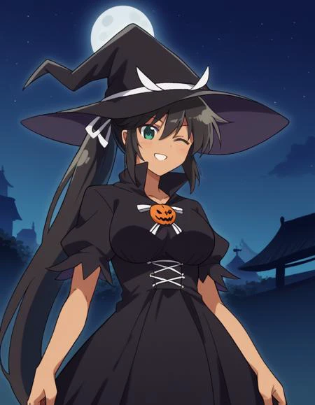 homura, long hair, black hair, ribbon, very long hair, green eyes, hair ribbon, ponytail, dark skin, dark-skinned female, large breasts,