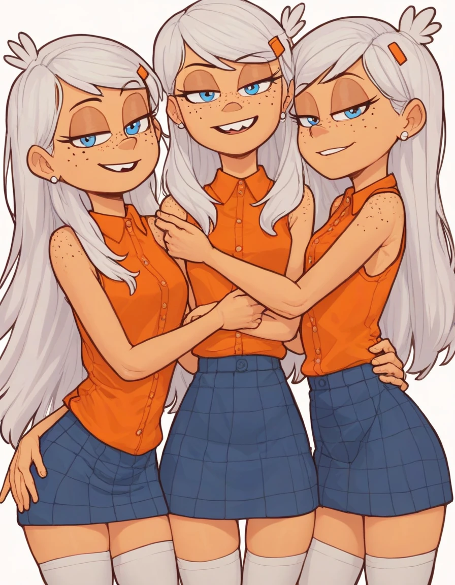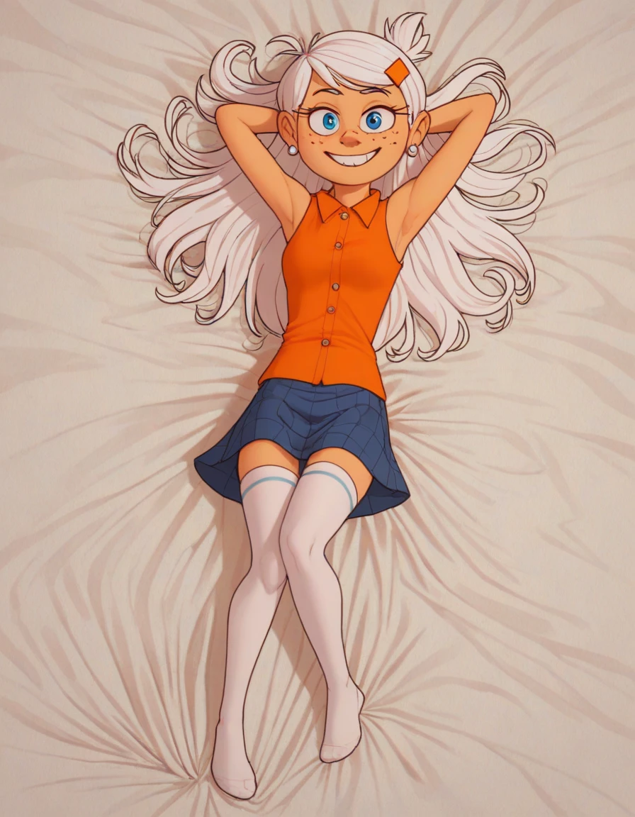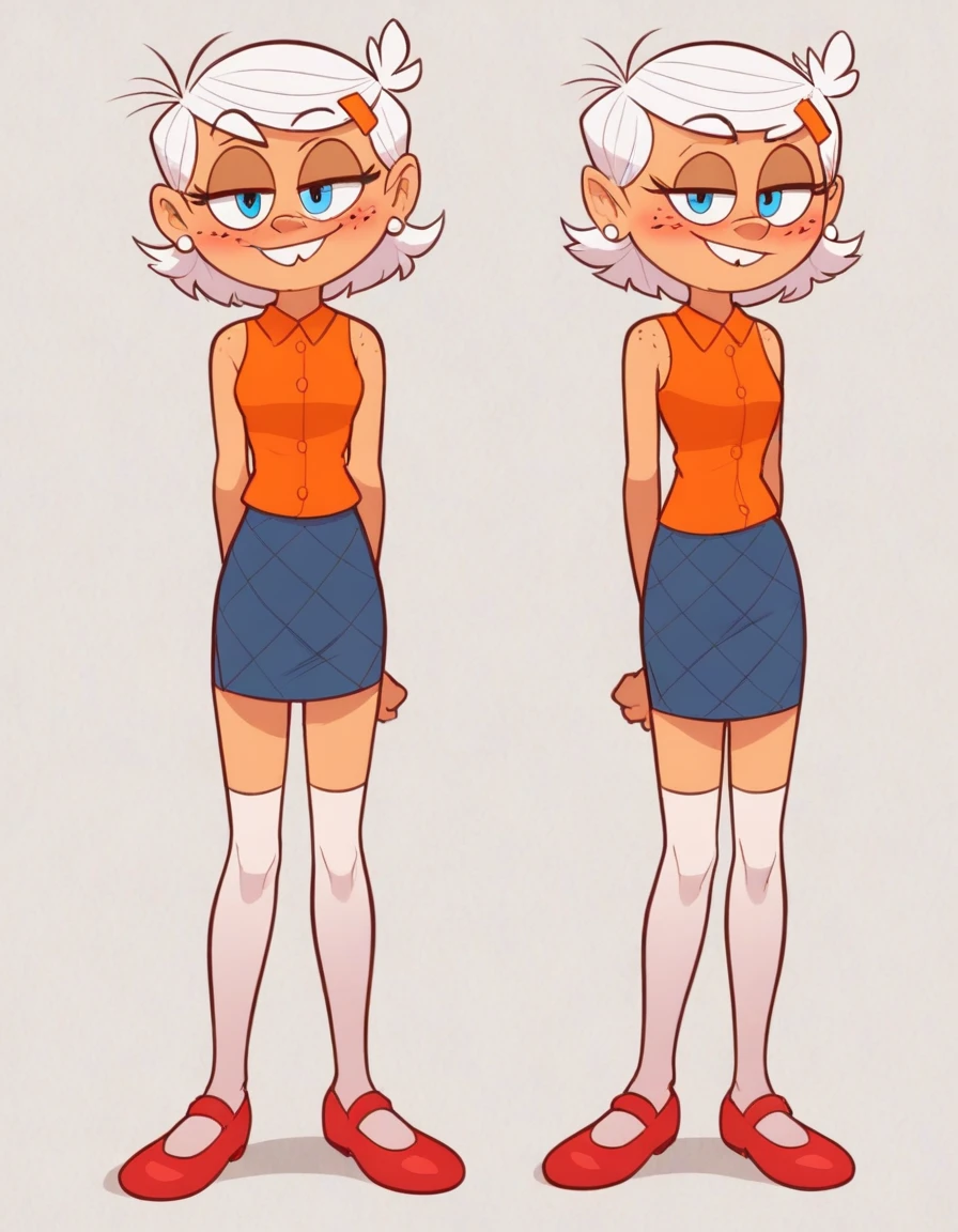 white hair, hairclip, buck teeth, freckles, orange shirt, sleeveless shirt, blue skirt, white thighhighs, earrings, red flats