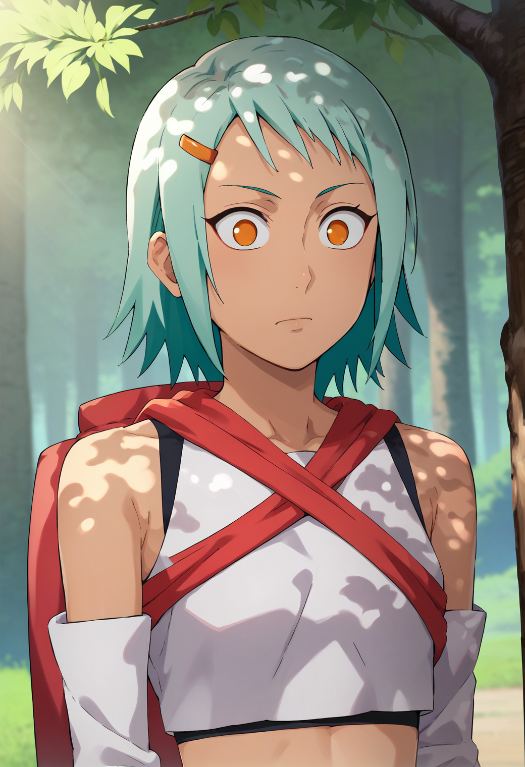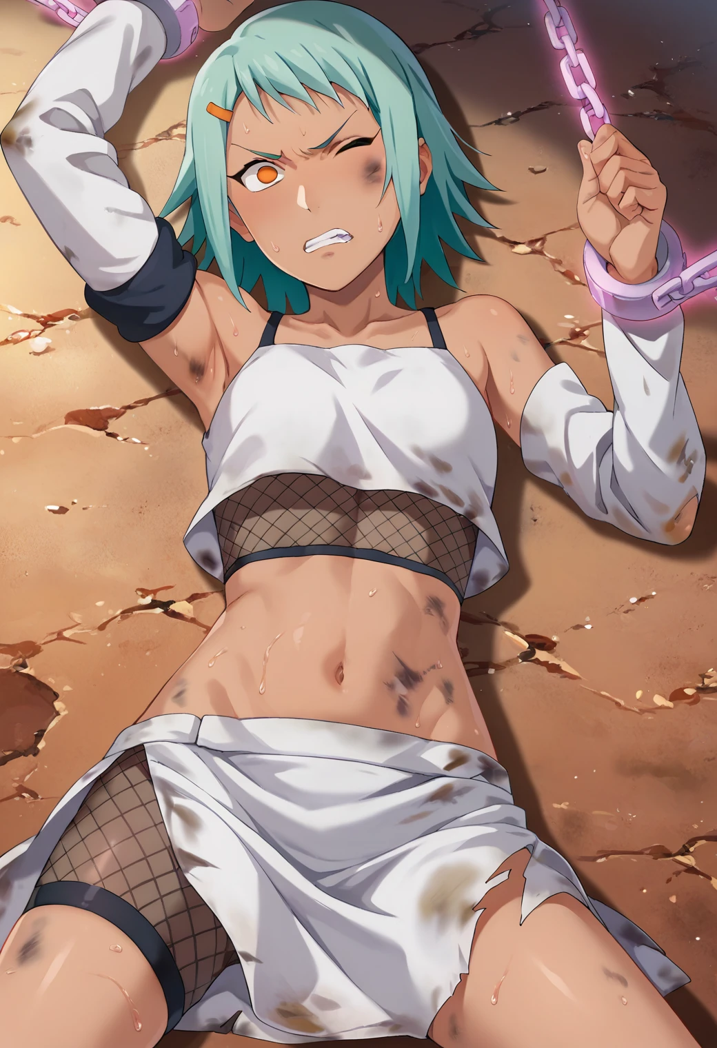 bare shoulders, white crop top, fishnets, hairclip, smile, blurrywings, fishnet top, armlet, detached sleeves, fishnet shorts, white skirt, groin, midriff, navel