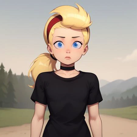 SissyBlakely, 1girl, solo, blue eyes, blonde hair, low ponytail, red hairband, black choker, black shirt, blue pants,