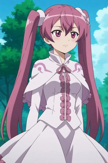 mine,long hair,ribbon,twintails,purple eyes,purple hair,very long hair,capelet, hair ornament,dress