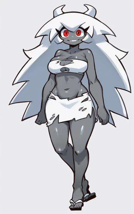 Reinforcement Tags: grey skin, white hair, horns, red eyes, shiny skin, navel, collarbone, long hair, white horns
