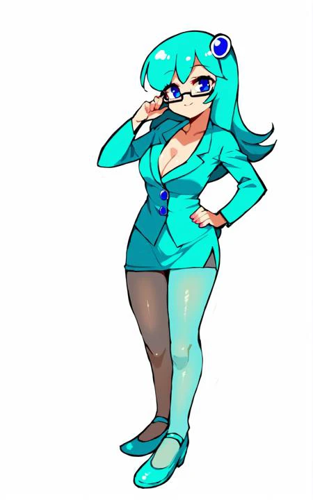 For her Outfit 1: pantyhose, dress, aqua hair, aqua dress, aqua shoes, aqua pantyhose, blazer, aqua blazer, layered clothing, under-rim eyewear