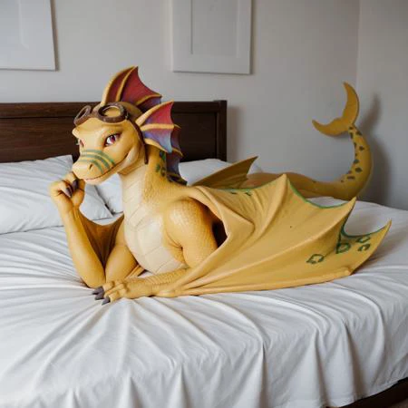 Additional Prompts: wyvern, green stripes on snout, head fins, crescent shaped tail tip, green spots on scales, green spots on wings , yellow scales, dragon, scales, wings, tail, female, red eyes