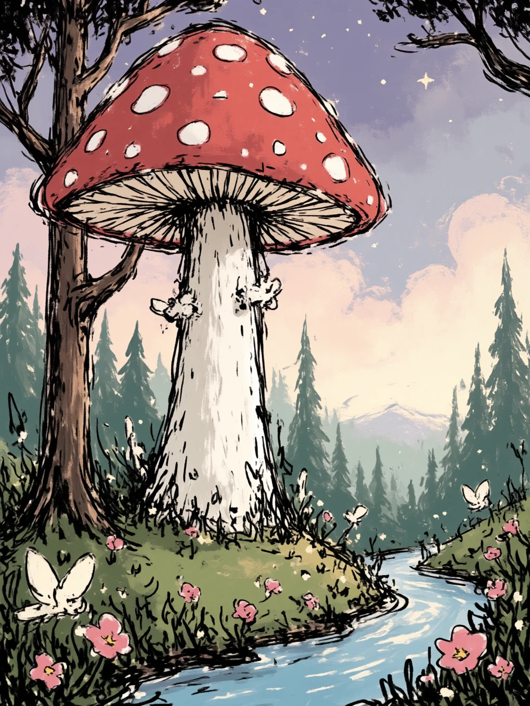 In a whimsical, surreal fairytale scene, a giant mushroom with bright red and white polka dots towers over a lush, enchanted forest. The scene is depicted in a colorful, exaggerated comic book style, and the mushroom is the magical residence. Tiny fantasy creatures with wings and glowing eyes flutter around, adding to the dreamlike atmosphere. Winding vines and glowing flowers decorate the ground, and a sparkling river winds through the landscape. The sky above is a pastel hue, and even in daylight, the stars are twinkling, creating a magical and enchanting feeling. ,liaocao