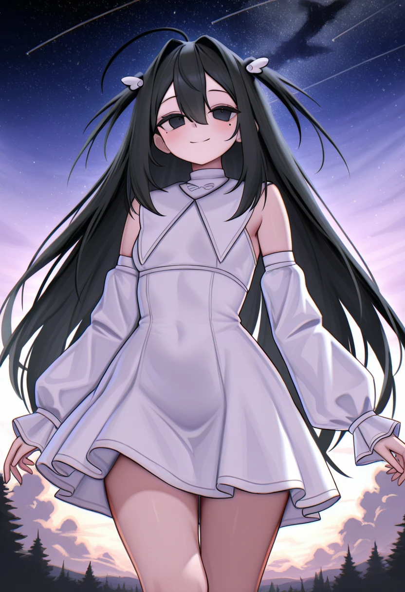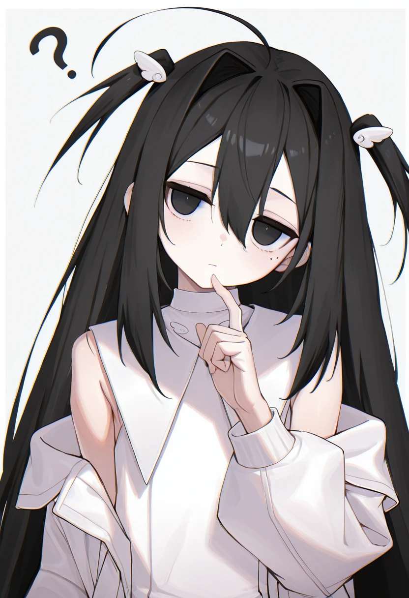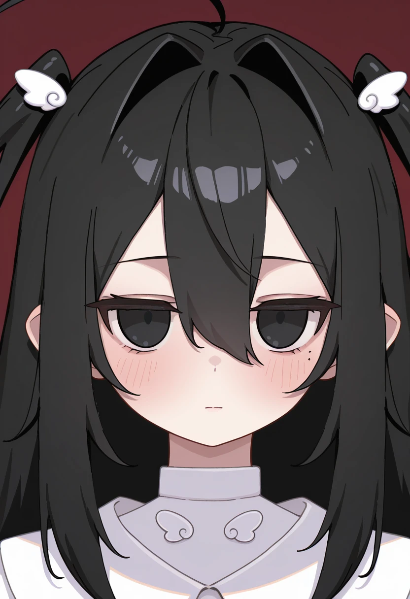 black hair, very long hair, two side up, hair between eyes, hair intakes, wing hair ornament, black eyes, mole under eye, ahoge,