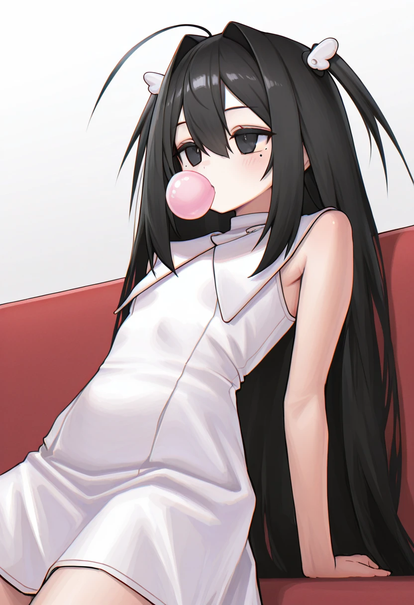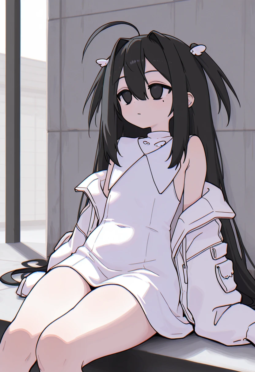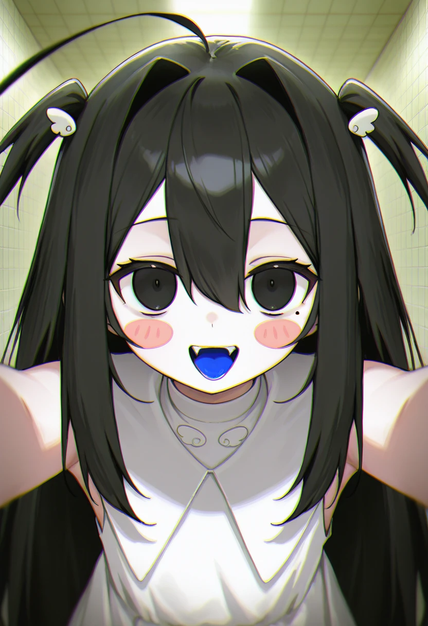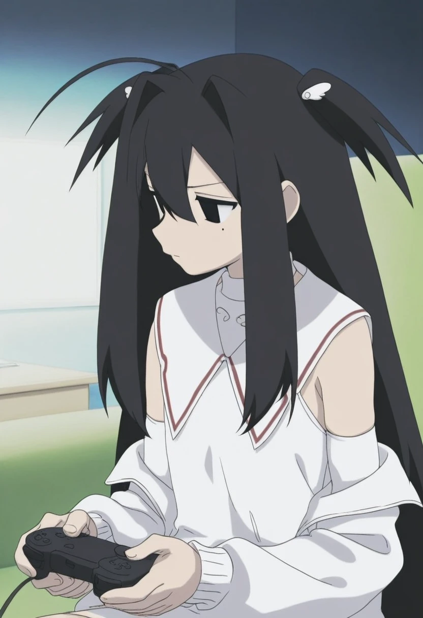 black hair, very long hair, two side up, hair between eyes, hair intakes, wing hair ornament, black eyes, mole under eye, ahoge,