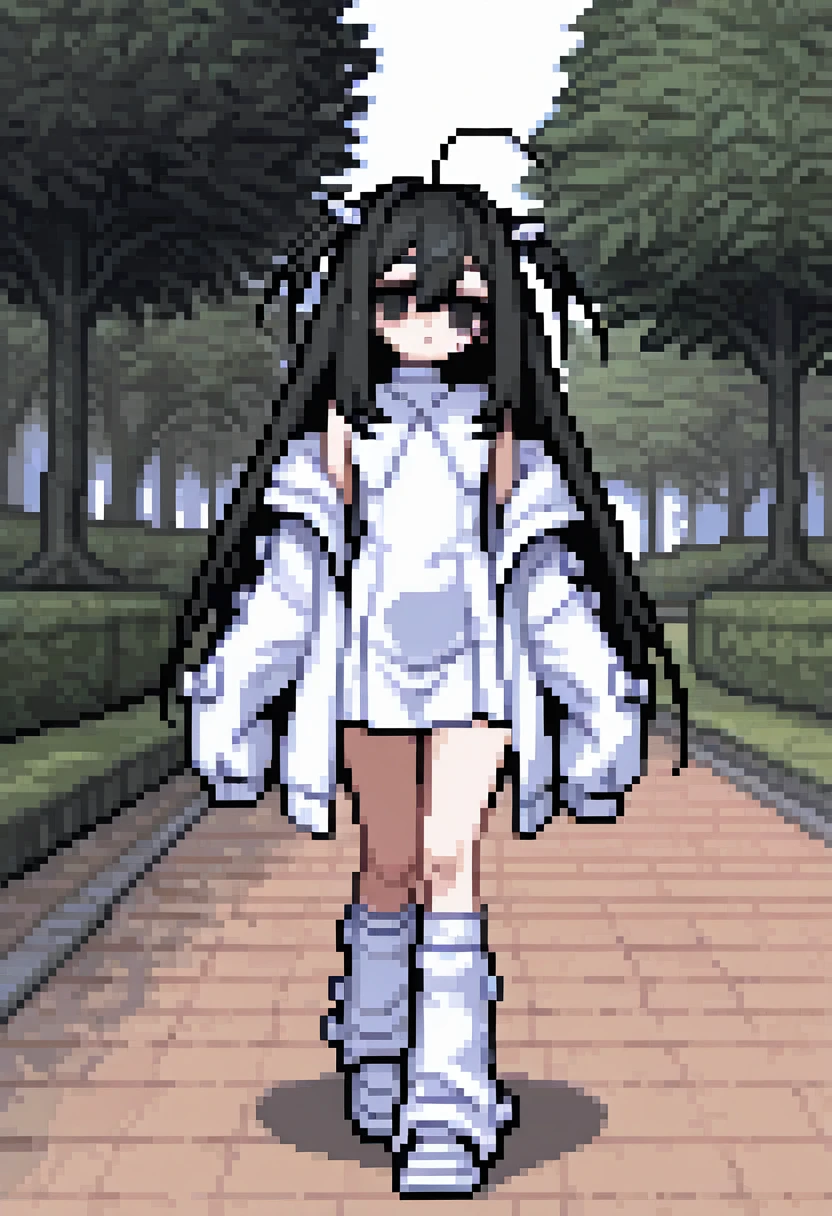 white dress, sleeveless dress, white shoulder, sleeves past fingers, leg warmers,