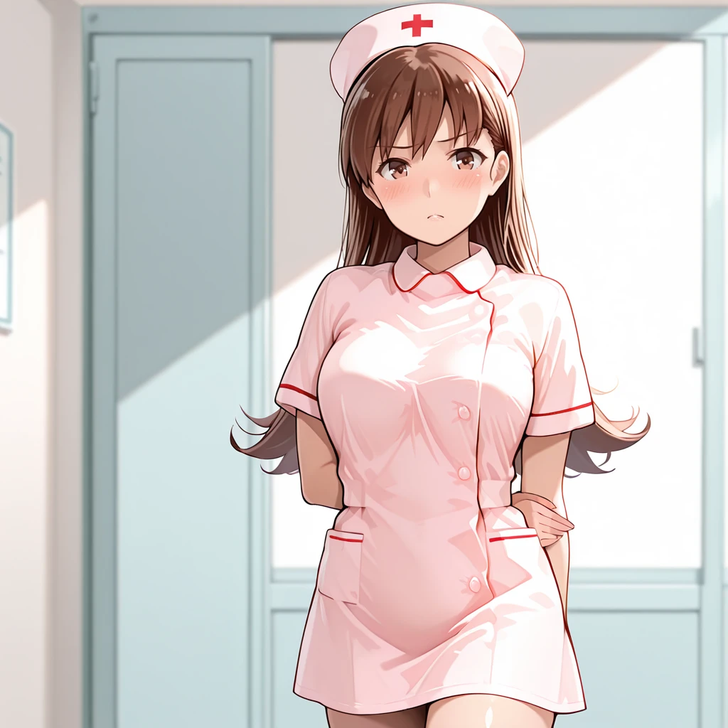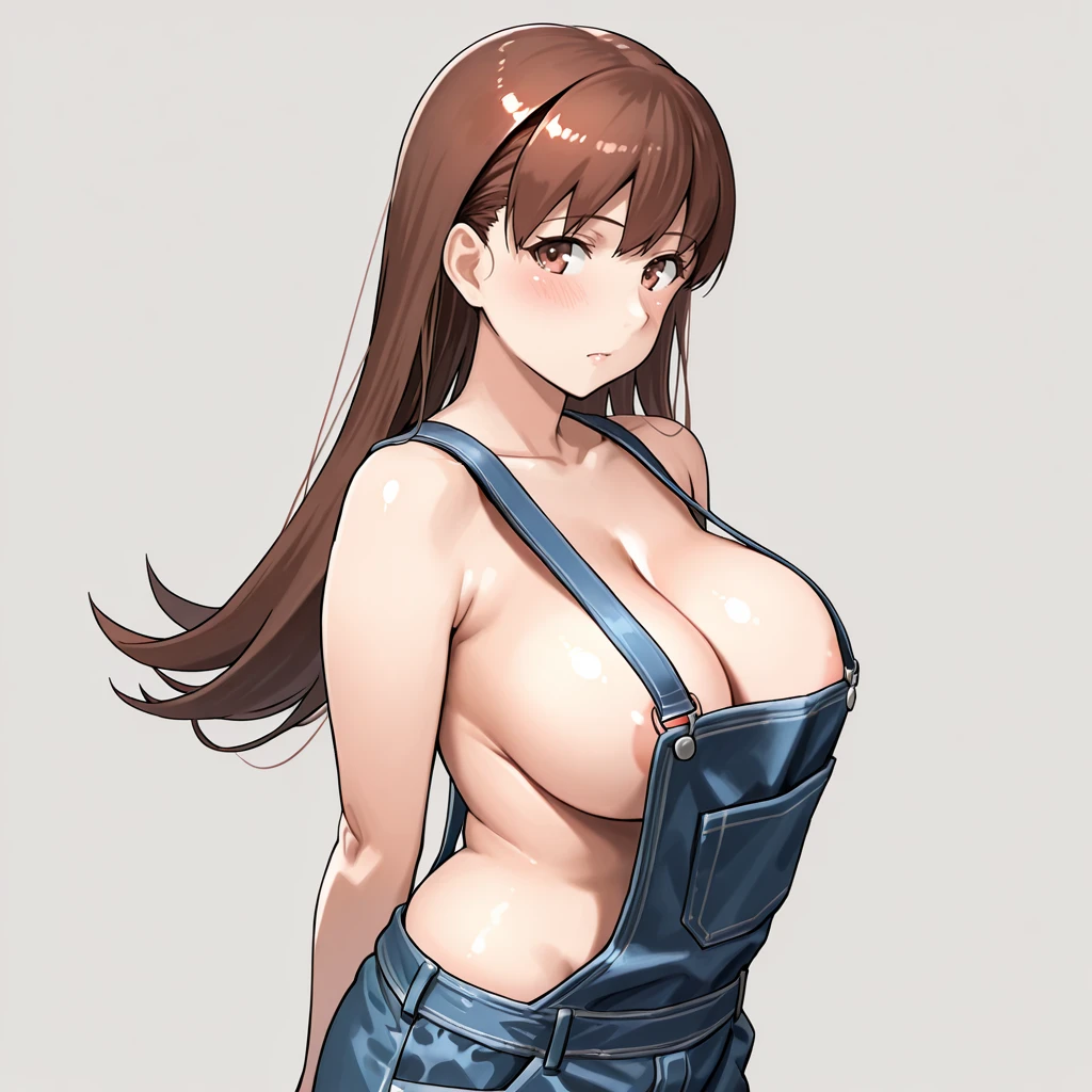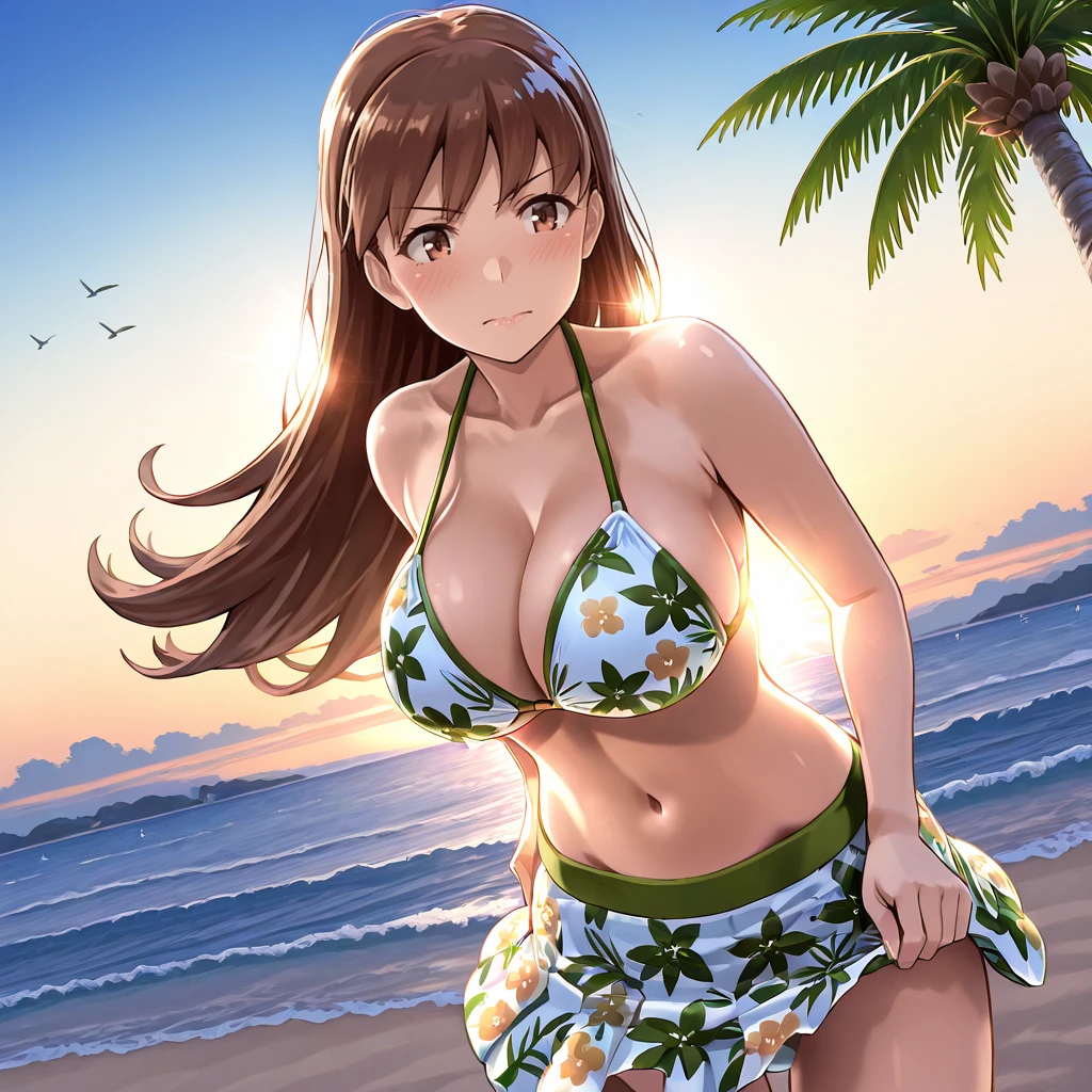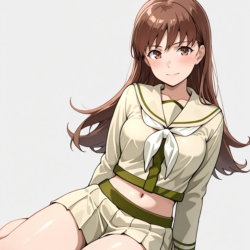 Trigger : OoiKaiNi, 1girl, ooi (kancolle), brown hair, pleated skirt, long hair, school uniform, serafuku, brown eyes, navel, white neckerchief, midriff, sailor collar, long sleeves