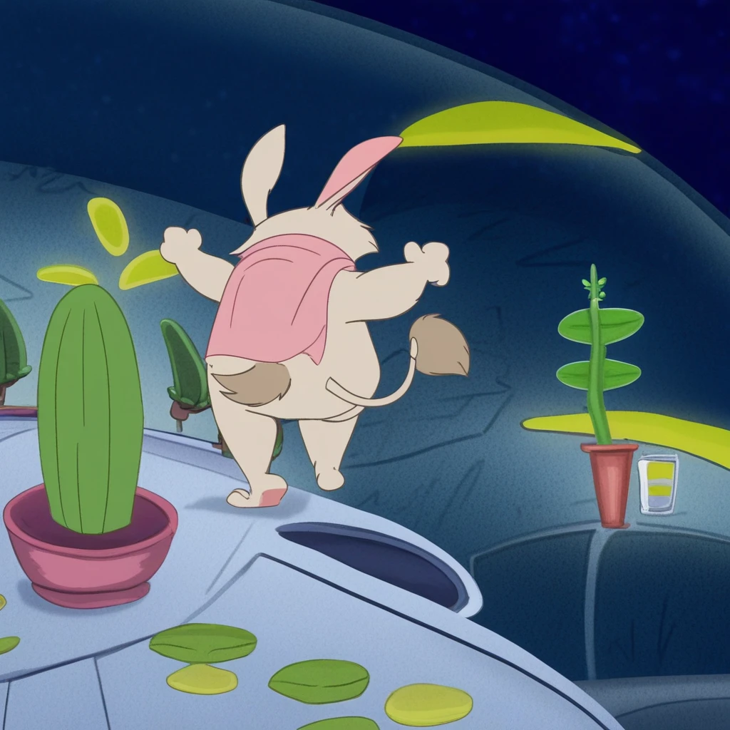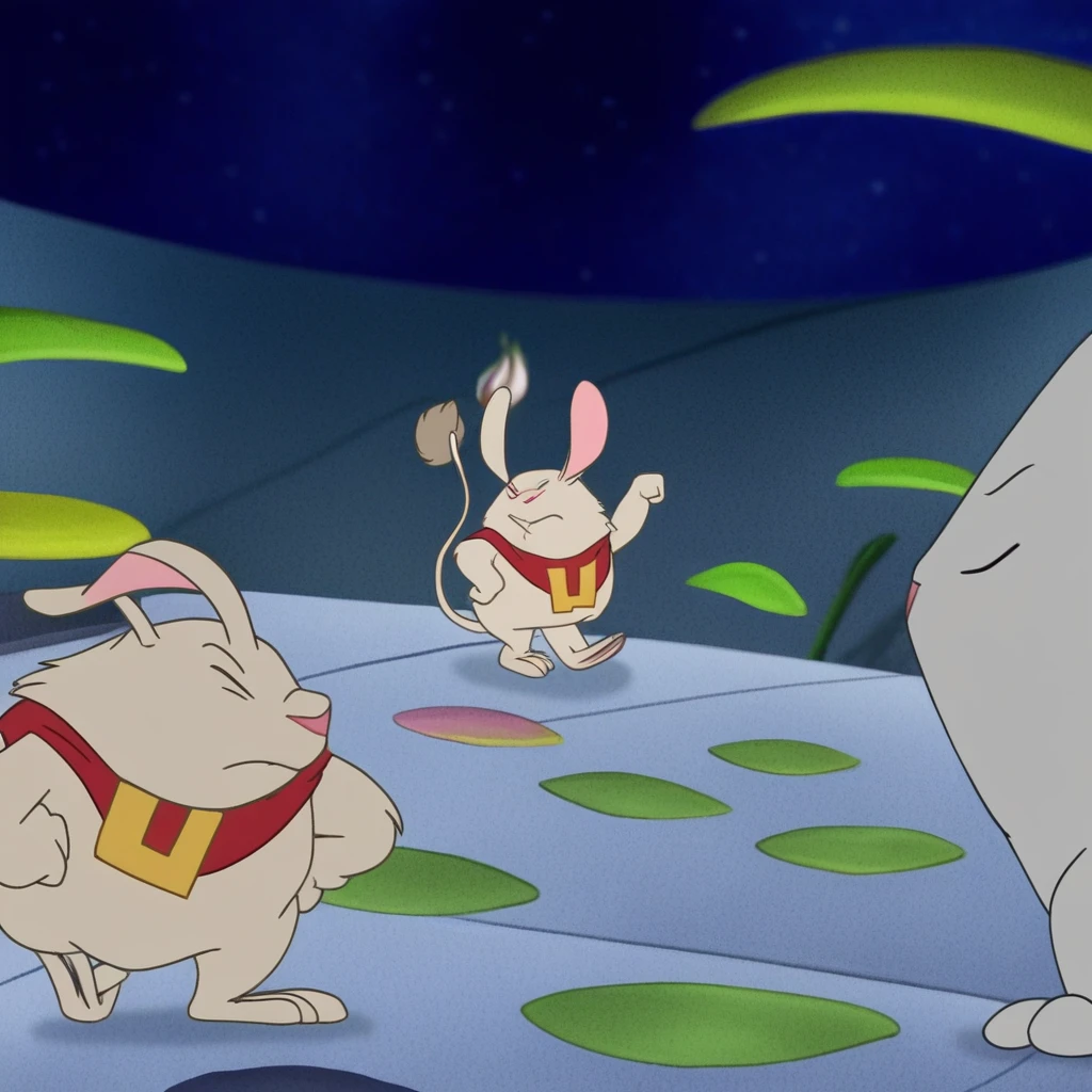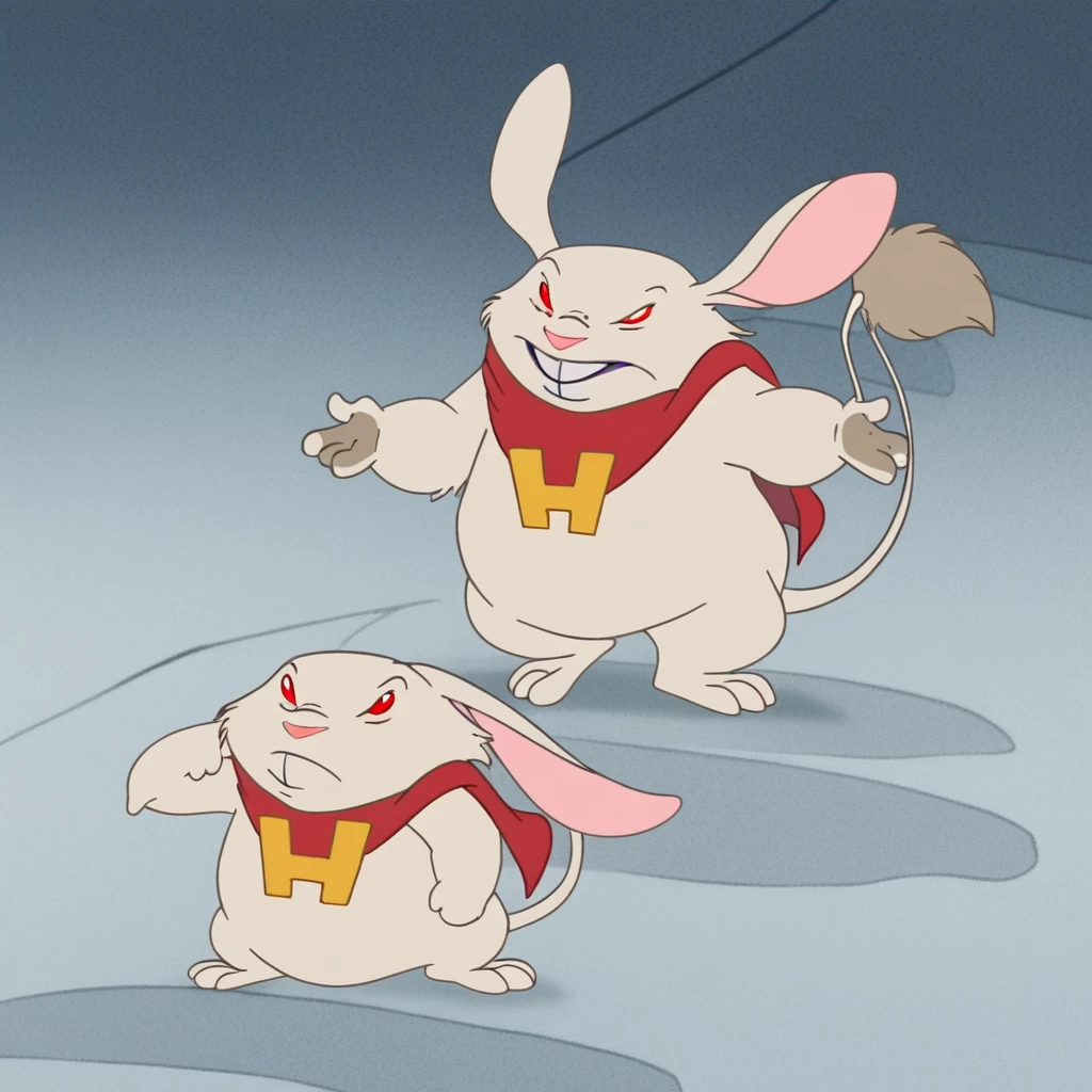 white fur, red eyes, rodent-like alien, short, chubby, long ears, pink ear innards, buck teeth, a pink nose, long tail, bushy brown fur tail tip