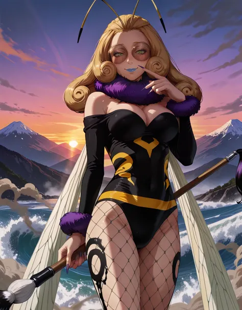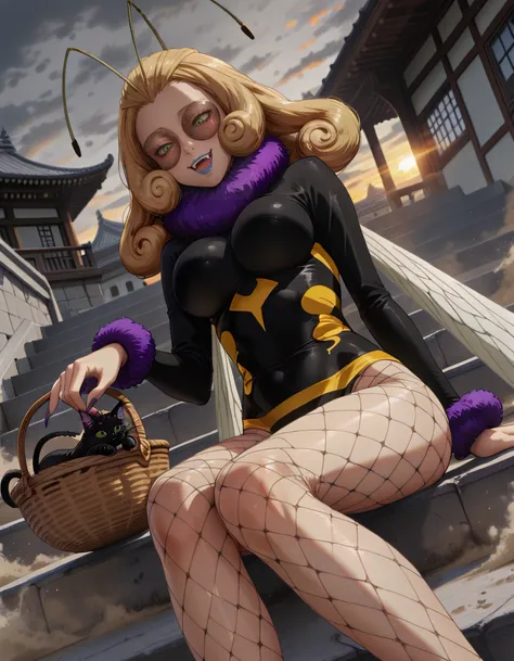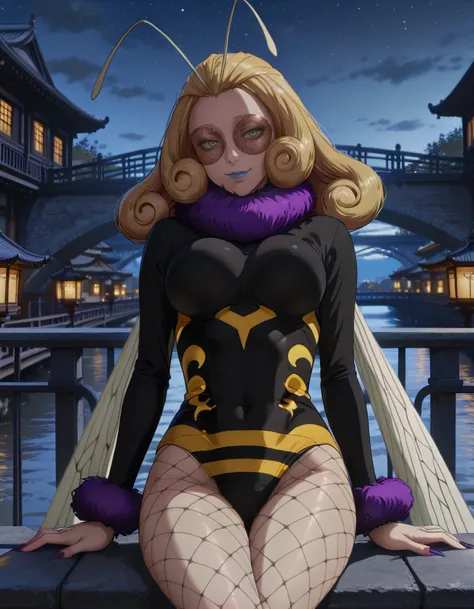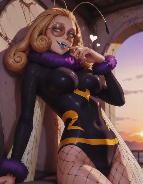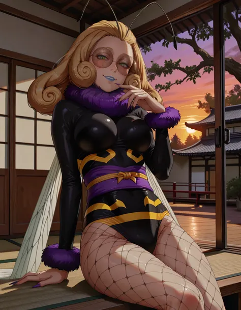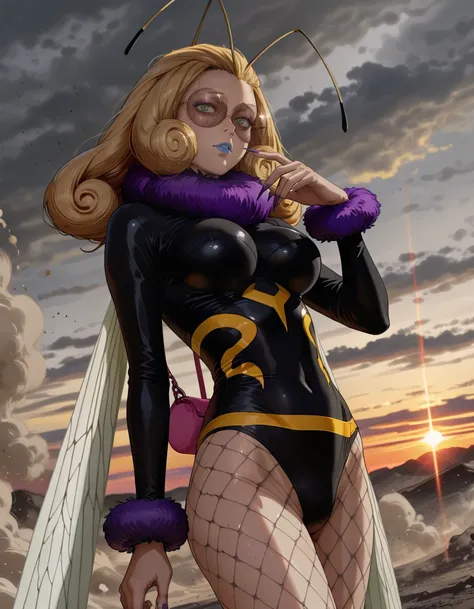 hornet, arthropod girl, antennae, long hair, curly hair, blonde hair, green eyes, sunglasses, makeup, blue lips, sharp fingernails, purple nails, fur collar, insect wings, fur trim, medium breasts, long sleeves, bodysuit, fishnet pantyhose